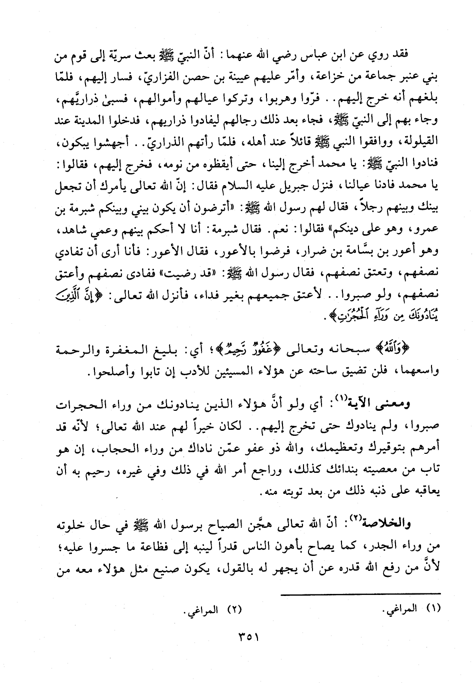فقد روي عن ابن عباس رضي الله عنهما: أنّ النبيّ - صلى الله عليه وسلم - بعث سريّة إلى قوم من بني عنبر جماعة من خزاعة، وأمّر عليهم عيينة بن حصن الفزاريّ، فسار إليهم، فلمّا بلغهم أنه خرج إليهم .. فرّوا وهربوا، وتركوا عيالهم وأموالهم، فسبى ذراريَّهم، وجاء بهم إلى النبيّ - صلى الله عليه وسلم -، فجاء بعد ذلك رجالهم ليفادوا ذراريهم، فدخلوا المدينة عند القيلولة، ووافقوا النبي - صلى الله عليه وسلم - قائلًا عند أهله، فلمّا رأتهم الذراريّ .. أجهشوا يبكون، فنادوا النبيّ - صلى الله عليه وسلم -: يا محمد أخرج إلينا، حتى أيقظوه من نومه، فخرج إليهم، فقالوا: يا محمد فادنا عيالنا، فنزل جبريل عليه السلام فقال: إنّ الله تعالى يأمرك أن تجعل بينك وبينهم رجلًا، فقال لهم رسول الله - صلى الله عليه وسلم -: "أترضون أن يكون بيني وبينكم شبرمة بن عمرو، وهو على دينكم" فقالوا: نعم. فقال شبرمة: أنا لا أحكم بينهم وعمي شاهد، وهو أعور بن بسَّامة بن ضرار، فرضوا بالأعور، فقال الأعور: فانا أرى أن تفادي نصفهم، وتعتق نصفهم، فقال رسول الله - صلى الله عليه وسلم -: "قد رضيت" ففادى نصفهم وأعتق نصفهم، ولو صبروا .. لأعتق جميعهم بغير فداء، فأنزل الله تعالى: {إِنَّ الَّذِينَ يُنَادُونَكَ مِنْ وَرَاءِ الْحُجُرَاتِ}.