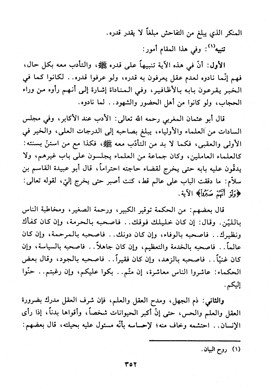 قال أبو عثمان المغربي رحمه الله تعالى: الأدب عند الأكابر، وفي مجلس السادات من العلماء والأولياء، يبلغ بصاحبه إلى الدرجات العلى، والخير في الأولى والعقبى، فكما لا بد من التأدّب معه - صلى الله عليه وسلم -، فكذا مع من استنّ بسنته: كالعلماء العاملين، وكان جماعة من العلماء يجلسون على باب غيرهم، ولا يدقّون عليه بابه حتى يخرج لقضاء حاجته احترامًا، قال أبو عبيدة القاسم بن سلّام: ما دققت الباب على عالم قط، كنت أصبر حتى يخرج إليّ، لقوله تعالى: {وَلَوْ أَنَّهُمْ صَبَرُوا} الآية.
