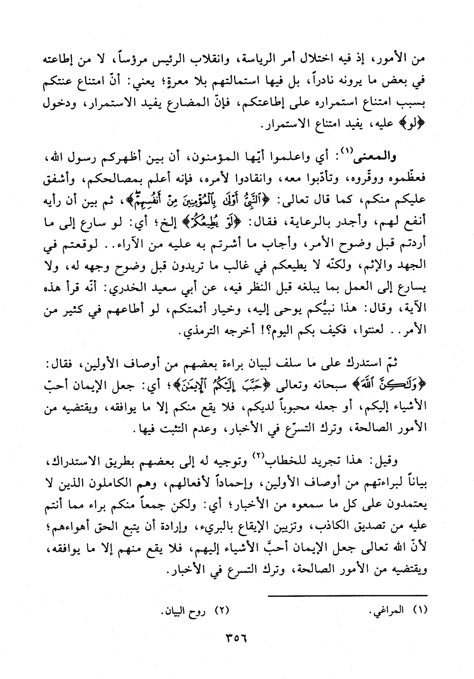 وقيل: هذا تجريد للخطاب (¬2) وتوجيه له إلى بعضهم بطريق الاستدراك، بيانًا لبراءتهم من أوصاف الأولين، وإحمادًا لأفعالهم، وهم الكاملون الذين لا يعتمدون على كل ما سمعوه من الأخبار؛ أي: ولكن جمعًا منكم براء مما أنتم عليه من تصديق الكاذب، وتزيين الإيقاع بالبريء، وإرادة أن يتبع الحق أهواءهم؛ لأنّ الله تعالى جعل الإيمان أحبَّ الأشياء إليهم، فلا يقع منهم إلا ما يوافقه، ويقتضيه من الأمور الصالحة، وترك التسرع في الأخبار.