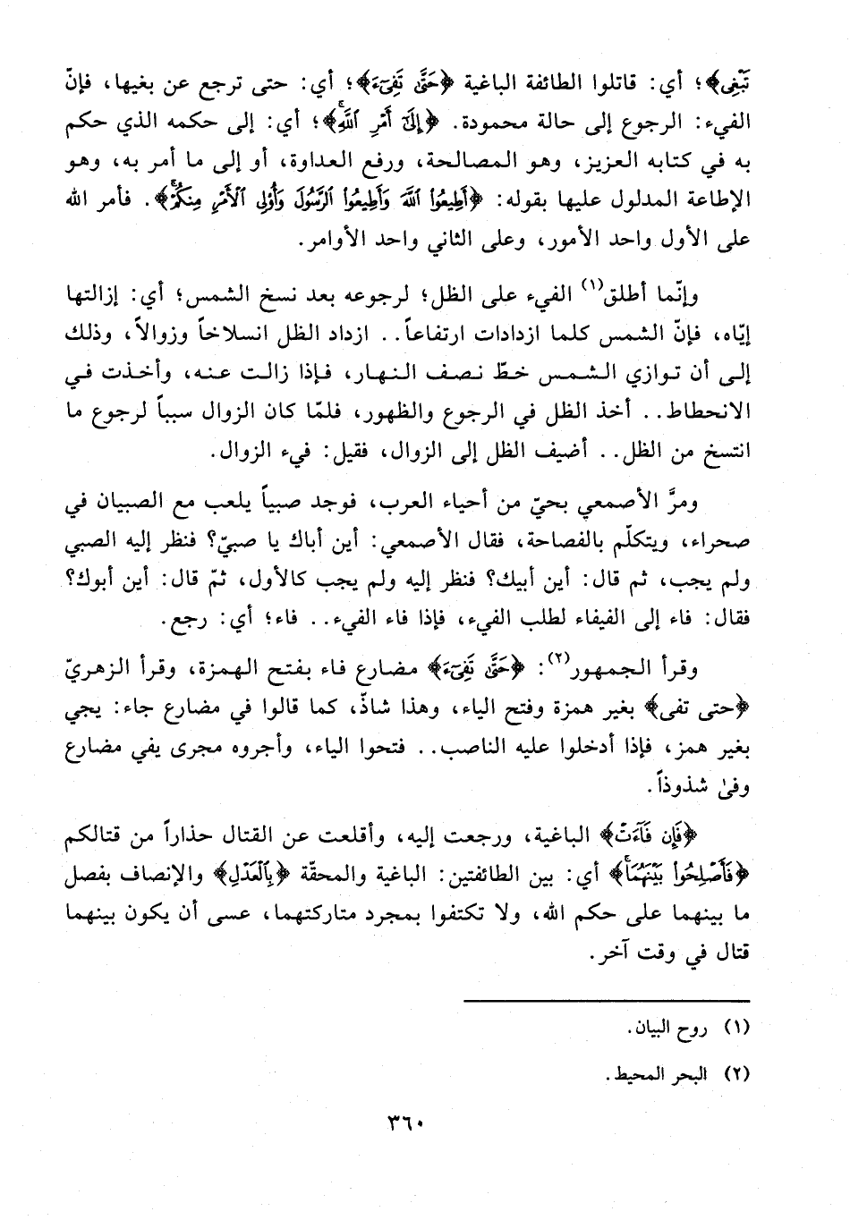 تَبْغِي}؛ أي: قاتلوا الطائفة الباغية {حَتَّى تَفِيءَ}؛ أي: حتى ترجع عن بغيها، فإنّ الفيء: الرجوع إلى حالة محمودة. {إِلَى أَمْرِ اللَّهِ}؛ أي: إلى حكمه الذي حكم به في كتابه العزيز، وهو المصالحة، ورفع العداوة، أو إلى ما أمر به، وهو الإطاعة المدلول عليها بقوله: {أَطِيعُوا اللَّهَ وَأَطِيعُوا الرَّسُولَ وَأُولِي الْأَمْرِ مِنْكُمْ}. فأمر الله على الأول واحد الأمور، وعلى الثاني واحد الأوامر.