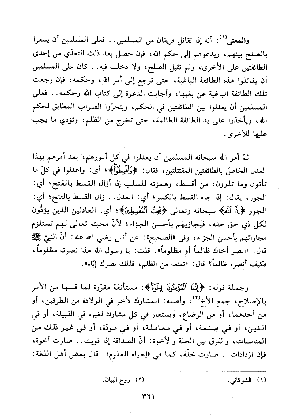 والمعنى (¬1): أنه إذا تقاتل فريقان من المسلمين .. فعلى المسلمين أن يسعوا بالصلح بينهم، ويدعوهم إلى حكم الله، فإن حصل بعد ذلك التعدّي من إحدى الطائفتين على الأخرى، ولم تقبل الصلح، ولا دخلت فيه .. كان على المسلمين أن يقاتلوا هذه الطائفة الباغية، حتى ترجع إلى أمر الله، وحكمه، فإن رجعت تلك الطائفة الباغية عن بغيها، وأجابت الدعوة إلى كتاب الله وحكمه .. فعلى المسلمين أن يعدلوا بين الطائفتين في الحكم، ويتحروا الصواب المطابق لحكم الله، ويأخذوا على يد الطائفة الظالمة، حتى تخرج من الظلم، وتؤدي ما يجب عليها للأخرى.
