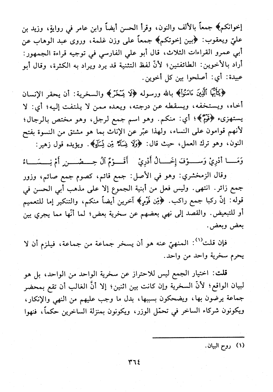 قلت: اختيار الجمع ليس للاحتراز عن سخرية الواحد من الواحد، بل هو لبيان الواقع؛ لأنّ السخرية وإن كانت بين اثنين؛ إلا أنَّ الغالب أن تقع بمحضر جماعة يرضون بها، ويضحكون بسببها، بدل ما وجب عليهم من النهي والإنكار، ويكونون شركاء الساخر في تحمّل الوزر، ويكونون بمنزلة الساخرين حكمًا، فنهوا