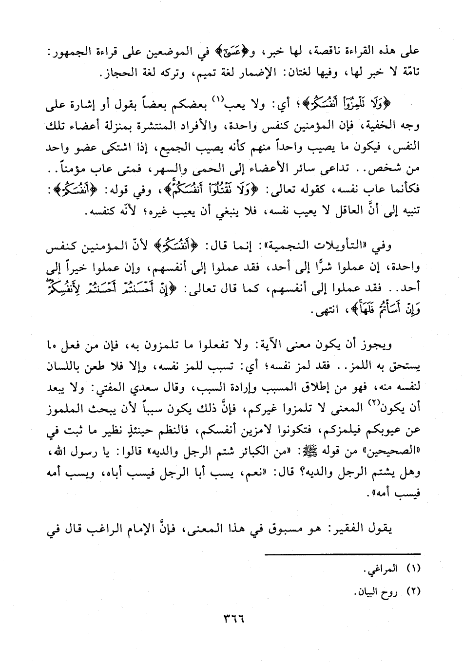 {وَلَا تَلْمِزُوا أَنْفُسَكُمْ}؛ أي: ولا يعب (¬1) بعضكم بعضًا بقول أو إشارة على وجه الخفية، فإن المؤمنين كنفس واحدة، والأفراد المنتشرة بمنزلة أعضاء تلك النفس، فيكون ما يصيب واحدًا منهم كأنه يصيب الجميع، إذا اشتكى عضو واحد من شخص .. تداعى سائر الأعضاء إلى الحمى والسهر، فمتى عاب مؤمنًا .. فكأنما عاب نفسه، كقوله تعالى: {وَلَا تَقْتُلُوا أَنْفُسَكُمْ}، وفي قوله: {أَنْفُسَكُمْ}: تنبيه إلى أنَّ العاقل لا يعيب نفسه، فلا ينبغي أن يعيب غيره؛ لأنّه كنفسه.