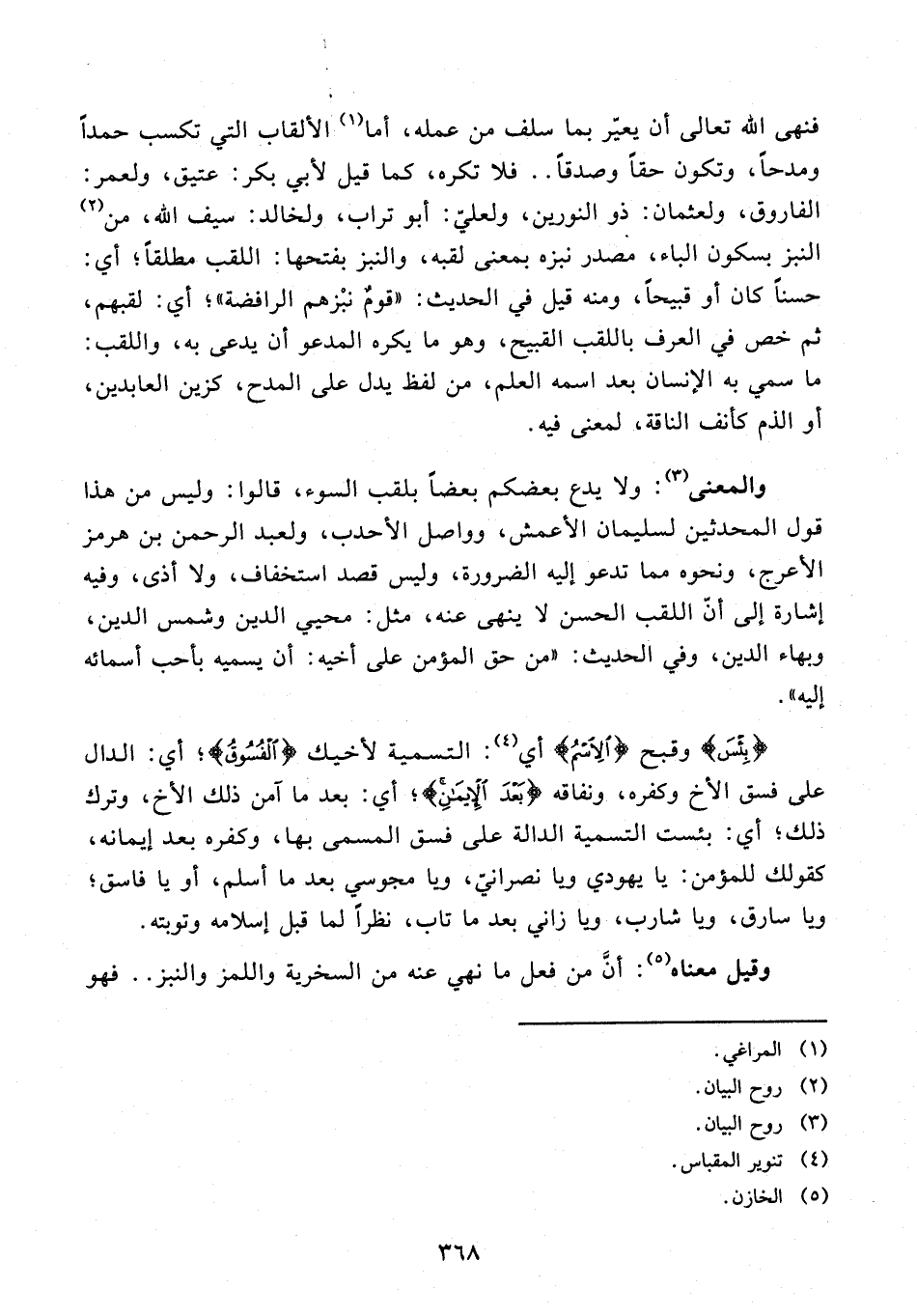 والمعنى (¬3): ولا يدع بعضكم بعضًا بلقب السوء، قالوا: وليس من هذا قول المحدثين لسليمان الأعمش، وواصل الأحدب، ولعبد الرحمن بن هرمز الأعرج، ونحوه مما تدعو إليه الضرورة، وليس قصد استخفاف، ولا أذى، وفيه إشارة إلى أنّ اللقب الحسن لا ينهى عنه، مثل: محيي الدين وشمس الدين، وبهاء الدين، وفي الحديث: "من حق المؤمن على أخيه: أن يسميه بأحب أسمائه إليه".