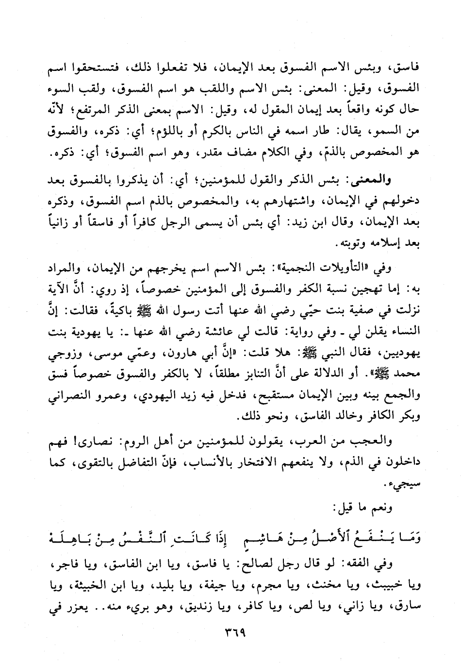 وفي "التأويلات النجمية": بئس الاسم اسم يخرجهم من الإيمان، والمراد به: إما تهجين نسبة الكفر والفسوق إلى المؤمنين خصوصًا، إذ روي: أنَّ الآية نزلت في صفية بنت حيّي رضي الله عنها أتت رسول الله - صلى الله عليه وسلم - باكيةً، فقالت: إنَّ النساء يقلن لي - وفي رواية: قالت لي عائشة رضي الله عنها -: يا يهودية بنت يهوديين، فقال النبي - صلى الله عليه وسلم -: هلا قلت: "إنَّ أبي هارون، وعمّي موسى، وزوجي محمد - صلى الله عليه وسلم - ". أو الدلالة على أنَّ التنابز مطلقًا، لا بالكفر والفسوق خصوصًا فسق والجمع بينه وبين الإيمان مستقبح، فدخل فيه زيد اليهودي، وعمرو النصراني وبكر الكافر وخالد الفاسق، ونحو ذلك.