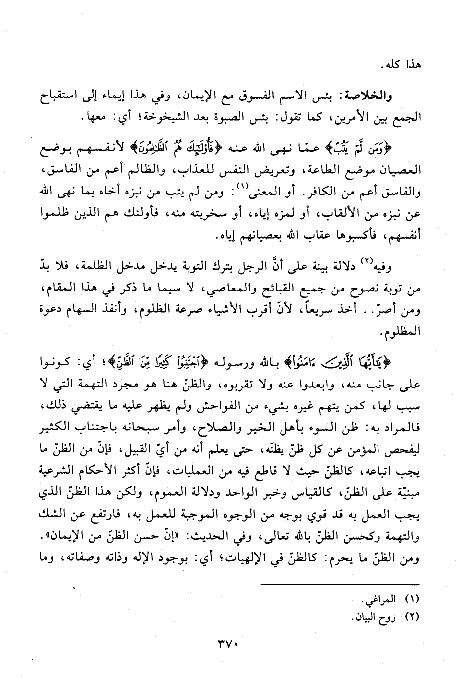 12 - {يَا أَيُّهَا الَّذِينَ آمَنُوا} بالله ورسوله {اجْتَنِبُوا كَثِيرًا مِنَ الظَّنِّ}؛ أي: كونوا على جانب منه، وابعدوا عنه ولا تقربوه، والظنّ هنا هو مجرد التهمة التي لا سبب لها، كمن يتهم غيره بشيء من الفواحش ولم يظهر عليه ما يقتضي ذلك، فالمراد به: ظن السوء بأهل الخير والصلاح، وأمر سبحانه باجتناب الكثير ليفحص المؤمن عن كل ظنّ يظنّه، حتى يعلم أنه من أيّ القبيل، فإنّ من الظنّ ما يجب اتباعه، كالظنّ حيث لا قاطع فيه من العمليات، فإنّ أكثر الأحكام الشرعية مبنيّة على الظنّ، كالقياس وخبر الواحد ودلالة العموم، ولكن هذا الظنّ الذي يجب العمل به قد قوي بوجه من الوجوه الموجبة للعمل به، فارتفع عن الشك والتهمة وكحسن الظنّ بالله تعالى، وفي الحديث: "إنّ حسن الظنّ من الإيمان". ومن الظنّ ما يحرم: كالظنّ في الإلهيات؛ أي: بوجود الإله وذاته وصفاته، وما