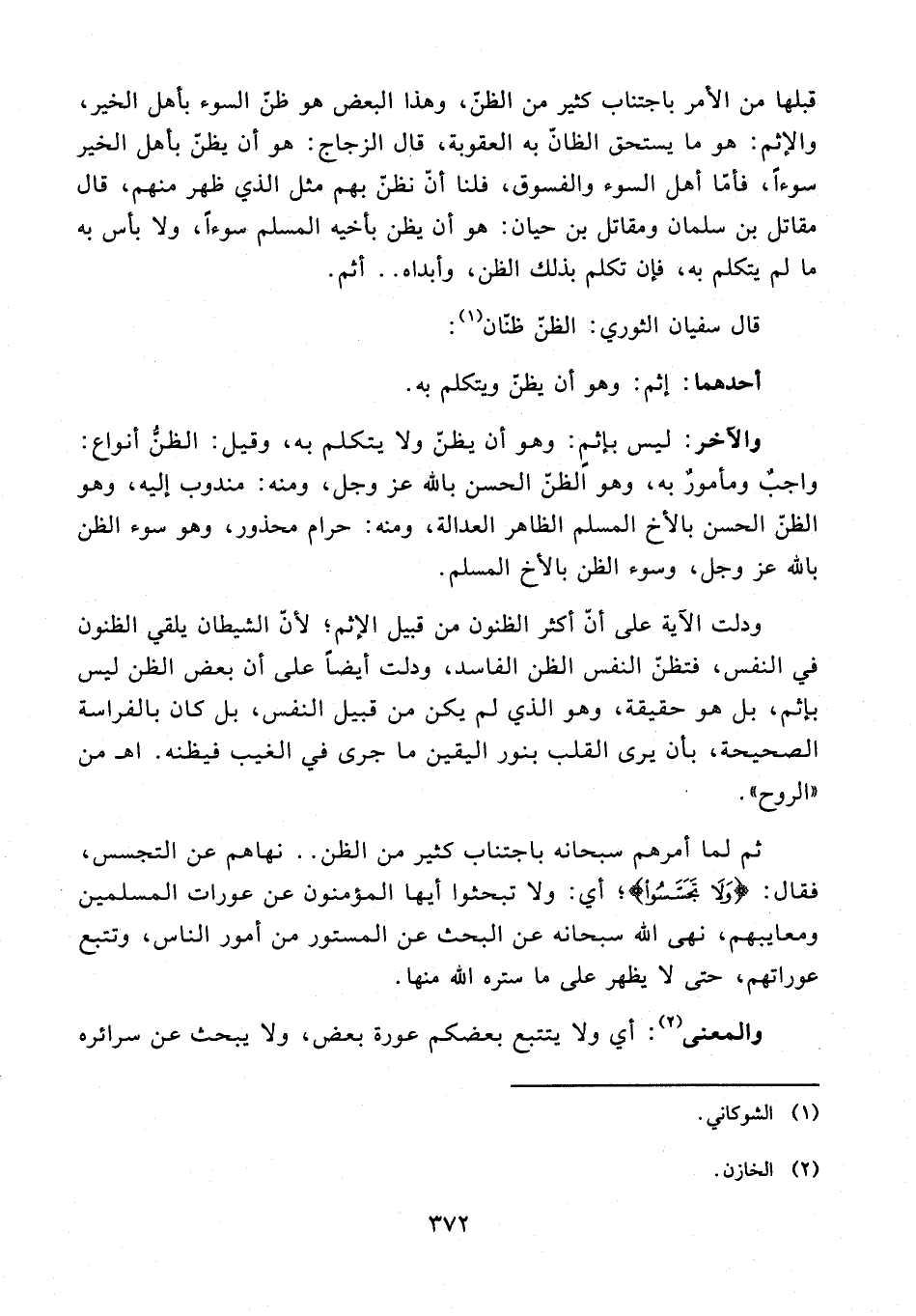 والآخر: ليس بإثمٍ: وهو أن يظنّ ولا يتكلم به، وقيل: الظنُّ أنواع: واجبٌ ومأمورٌ به، وهو الظن الحسن بالله عَزَّ وَجَلَّ، ومنه: مندوب إليه، وهو الظنّ الحسن بالأخ المسلم الظاهر العدالة، ومنه: حرام محذور، وهو سوء الظن بالله عَزَّ وَجَلَّ، وسوء الظن بالأخ المسلم.