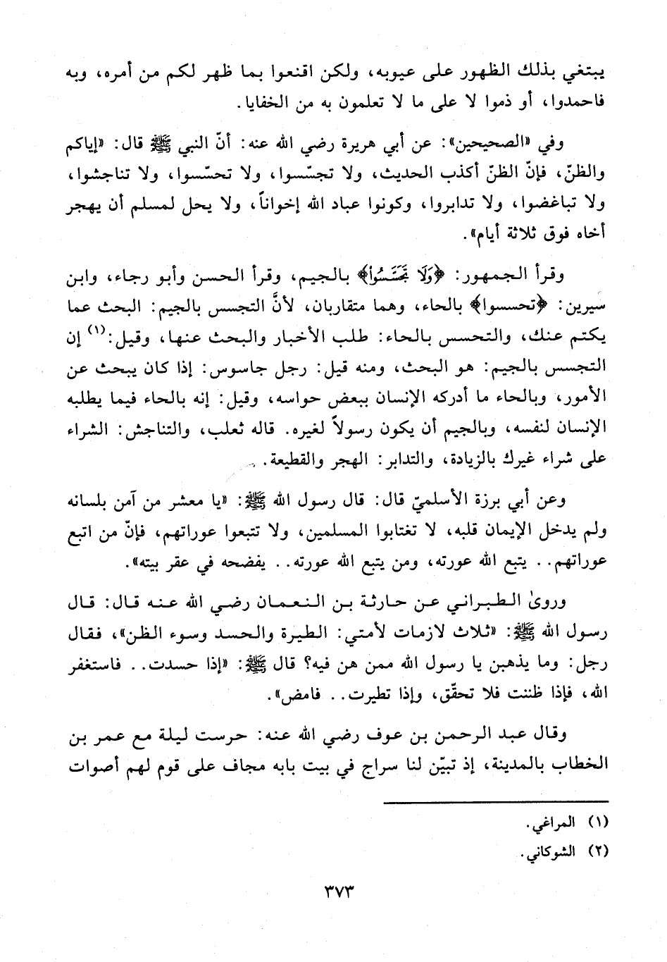 وفي "الصحيحين": عن أبي هريرة رضي الله عنه: أن النبي - صلى الله عليه وسلم - قال: "إياكم والظنّ، فإنّ الظنّ أكذب الحديث، ولا تجسّسوا، ولا تحسّسوا، ولا تناجشوا، ولا تباغضوا، ولا تدابروا، وكونوا عباد الله إخوانًا، ولا يحل لمسلم أن يهجر أخاه فوق ثلاثة أيام.