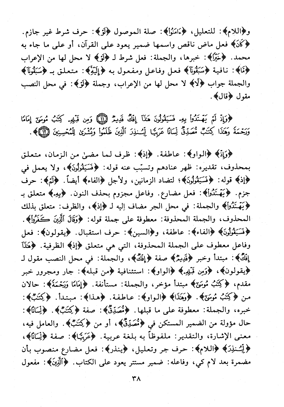 {وَإِذْ} {الواو}: عاطفة. {إذ}: ظرف لما مضى من الزمان، متعلق بمحذوف، تقديره: ظهر عنادهم وتسبّب عنه قوله: {فَسَيَقُولُونَ}، ولا يعمل في {إذ} قوله: {فَسَيَقُولونَ}؛ لتضاد الزمانين، ولأجل {الفاء} أيضًا. {لَمْ}: حرف جزم. {يَهْتَدُوا}: فعل مضارع. وفاعل جزوم بحذف النون. {بِهِ} متعلق بـ {يَهْتَدُوا} والجملة: في محل الجر مضاف إليه لـ {إذ}، والظرف: متعلق بذلك المحذوف، والجملة المحذوفة: معطوفة عمى جملة قوله: {وَقَالَ الَّذِينَ كَفَرُوا}. {فَسَيَقُولونَ} {الفاء}: عاطفة، و {السين}: حرف استقبال. {يقولون}: فعل وفاعل معطوف على الجملة المحذوفة، التي هي متعلق {إذ} الظرفية. {هَذَا إِفْكٌ}: مبتدأ وخبر {قَدِيمٌ} صفة {إِفْكٌ}، والجملة: في محل النصب مقول لـ {يقولون}، {وَمِنْ قَبْلِهِ} {الواو}: استئنافية {من قبله}: جار ومجرور خبر مقدم، {كِتَابُ مُوسَى} مبتدأ مؤخر، والجملة: مستأنفة. {إِمَامًا وَرَحْمَةً}: حالان من {كِتَابُ مُوسَى}. {وَهَذَا} {الواو}: عاطفة. {هذا}: مبتدأ. {كِتَابٌ}: خبره، والجملة: معطوفة على ما قبلها. {مُصَدِّقٌ}: صفة {كِتَابٌ}. {لِسَانًا}: حال مؤولة من الضمير المستكن في {مُصَدِّقٌ}، أو من {كِتَابٌ}. والعامل فيه، معنى الإشارة، والتقدير: ملفوظًا به بلغة عربية. {عَرَبِيًّا}: صفة {لِسَانًا}، {لِيُنْذِرَ} {اللام}: حرف جر وتعليل، {ينذر}: فعل مضارع منصوب بأن مضمرة بعد لام كي، وفاعله: ضمير مستتر يعود على الكتاب. {الَّذِينَ}: مفعول