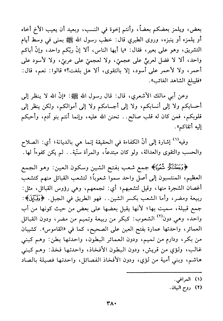 {وَجَعَلْنَاكُمْ شُعُوبًا} جمع شعب بفتح الشين وسكون العين: وهو الجمع العظيم، المنتسبون إلى أصل واحد سموا شعوبًا؛ لتشعب القبائل منهم كتشعب أغصان الشجرة منها، وقيل لتشعبهم؛ أي: تجمعهم، وهي رؤوس القبائل، مثل: ربيعة ومضر، وأما الشعب بكسر الشين .. فهو الطريق في الجبل. {وَقَبَائِلَ}: جمع قبيلة، سميت بها؛ لأنها يقبل بعضها على بعض من حيث كونها من أب واحد، وهي دون (¬2) الشعوب: كبكر من ربيعة وتميم من مضر، ودون القبائل العمائر، واحدتها عمارة بفتح العين على الصحيح، كما في "القاموس". كشيبان من بكر، ودارم من تميم، ودون العمائر البطون، واحدتها بطن: وهم كبني غالب، ولؤي من قريش، ودون البطون الأفخاذ، واحدتها فخذ: وهم كبني هاشم، وبني أمية من لؤي، ودون الأفخاذ الفصائل، واحدتها فصيلة بالصاد
