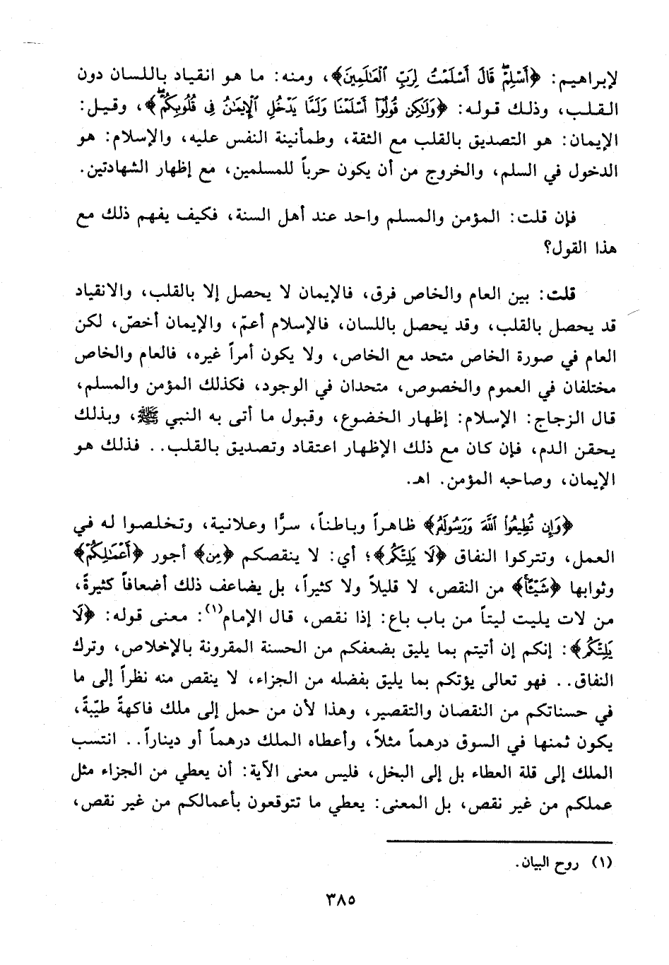 لإبراهيم: {أَسْلِمْ قَالَ أَسْلَمْتُ لِرَبِّ الْعَالَمِينَ}، ومنه: ما هو انقياد باللسان دون القلب، وذلك قوله: {وَلَكِنْ قُولُوا أَسْلَمْنَا وَلَمَّا يَدْخُلِ الْإِيمَانُ فِي قُلُوبِكُمْ}، وقيل: الإيمان: هو التصديق بالقلب مع الثقة، وطمأنينة النفس عليه، والإِسلام: هو الدخول في السلم، والخروج من أن يكون حربًا للمسلمين، مع إظهار الشهادتين.