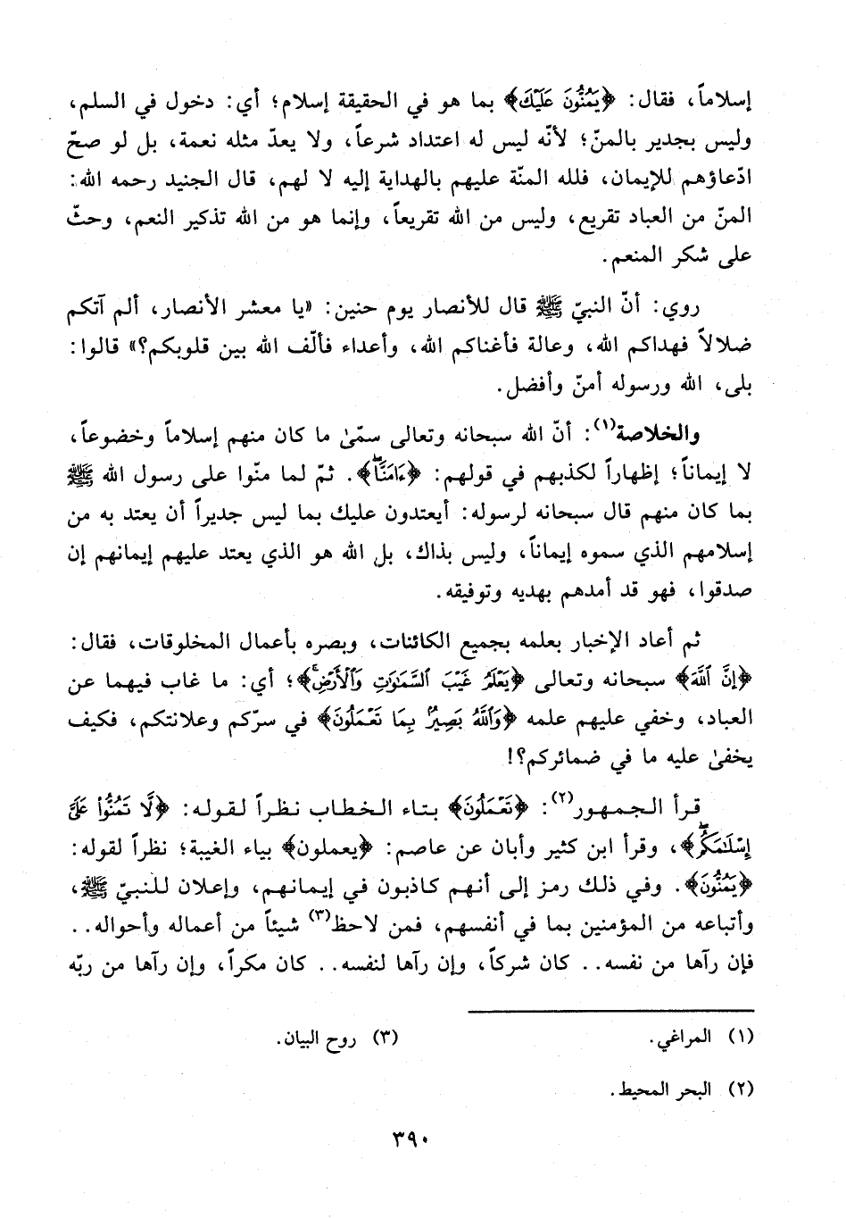 إسلامًا، فقال: {يَمُنُّونَ عَلَيْكَ} بما هو في الحقيقة إسلام؛ أي: دخول في السلم، وليس بجدير بالمنّ؛ لأنَّه ليس له اعتداد شرعًا، ولا يعد مثله نعمة، بل لو صحّ ادّعاؤهم للإيمان، فلله المنّة عليهم بالهداية إليه لا لهم، قال الجنيد رحمه الله: المنّ من العباد تقريع، وليس من الله تقريعًا، وإنما هو من الله تذكير النعم، وحثّ على شكر المنعم.