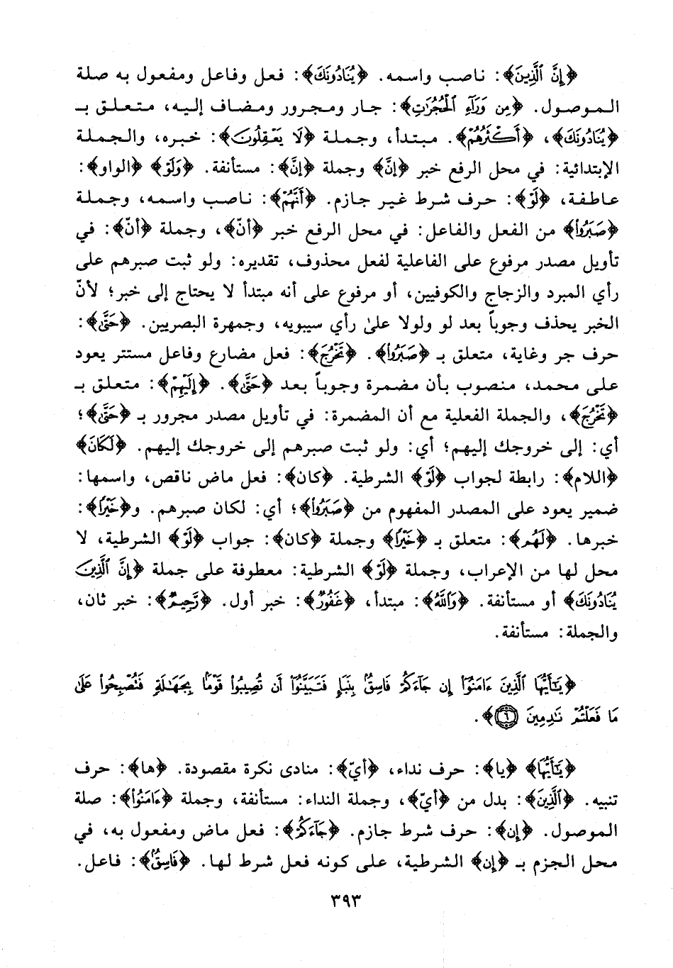 {إِنَّ الَّذِينَ}: ناصب واسمه. {يُنَادُونَكَ}: فعل وفاعل ومفعول به صلة الموصول. {مِنْ وَرَاءِ الْحُجُرَاتِ}: جار ومجرور ومضاف إليه، متعلق بـ {يُنَادُونَكَ}، {أَكْثَرُهُمْ}. مبتدأ، وجملة {لَا يَعْقِلُونَ}: خبره، والجملة الإبتدائية: في محل الرفع خبر {إنَّ} وجملة {إنَّ}: مستأنفة. {وَلَوْ} {الواو}: عاطفة، {لَوْ}: حرف شرط غير جازم. {أَنَّهُمْ}: ناصب واسمه، وجملة {صَبَرُوا} من الفعل والفاعل: في محل الرفع خبر {أَنَّ} وجملة {إنَّ}: في تأويل مصدر مرفوع على الفاعلية لفعل محذوف، تقديره: ولو ثبت صبرهم على رأي المبرد والزجاج والكوفيين، أو مرفوع على أنه مبتدأ لا يحتاج إلى خبر؛ لأنّ الخبر يحذف وجوبًا بعد لو ولولا على رأي سيبويه، وجمهرة البصريين. {حَتَّى}: حرف جر وغاية، متعلق بـ {صَبَرُوا}. {تَخْرُجَ}: فعل مضارع وفاعل مستتر يعود على محمد، منصوب بأن مضمرة وجوبًا بعد {حَتَّى}. {إِلَيْهِمْ}: متعلق بـ {تَخْرُجَ}، والجملة الفعلية مع أن المضمرة: في تأويل مصدر مجرور بـ {حَتَّى}؛ أي: إلى خروجك إليهم؛ أي: ولو ثبت صبرهم إلى خروجك إليهم. {لَكَانَ} {اللام}: رابطة لجواب {لَوْ} الشرطية. {كان}: فعل ماض ناقص، واسمها: ضمير يعود على المصدر المفهوم من {صَبَرُوا}؛ أي: لكان صبرهم. و {خَيْرًا}: خبرها. {لَهُمْ}: متعلق بـ {خَيْرًا} وجملة {كان}: جواب {لَوْ} الشرطية، لا محل لها من الإعراب، وجملة {لَوْ} الشرطية: معطوفة على جملة {إِنَّ الَّذِينَ يُنَادُونَكَ} أو مستأنفة. {وَاللَّهُ}: مبتدأ، {غَفُورٌ}: خبر أول. {رَحِيمٌ}: خبر ثان، والجملة: مستأنفة.