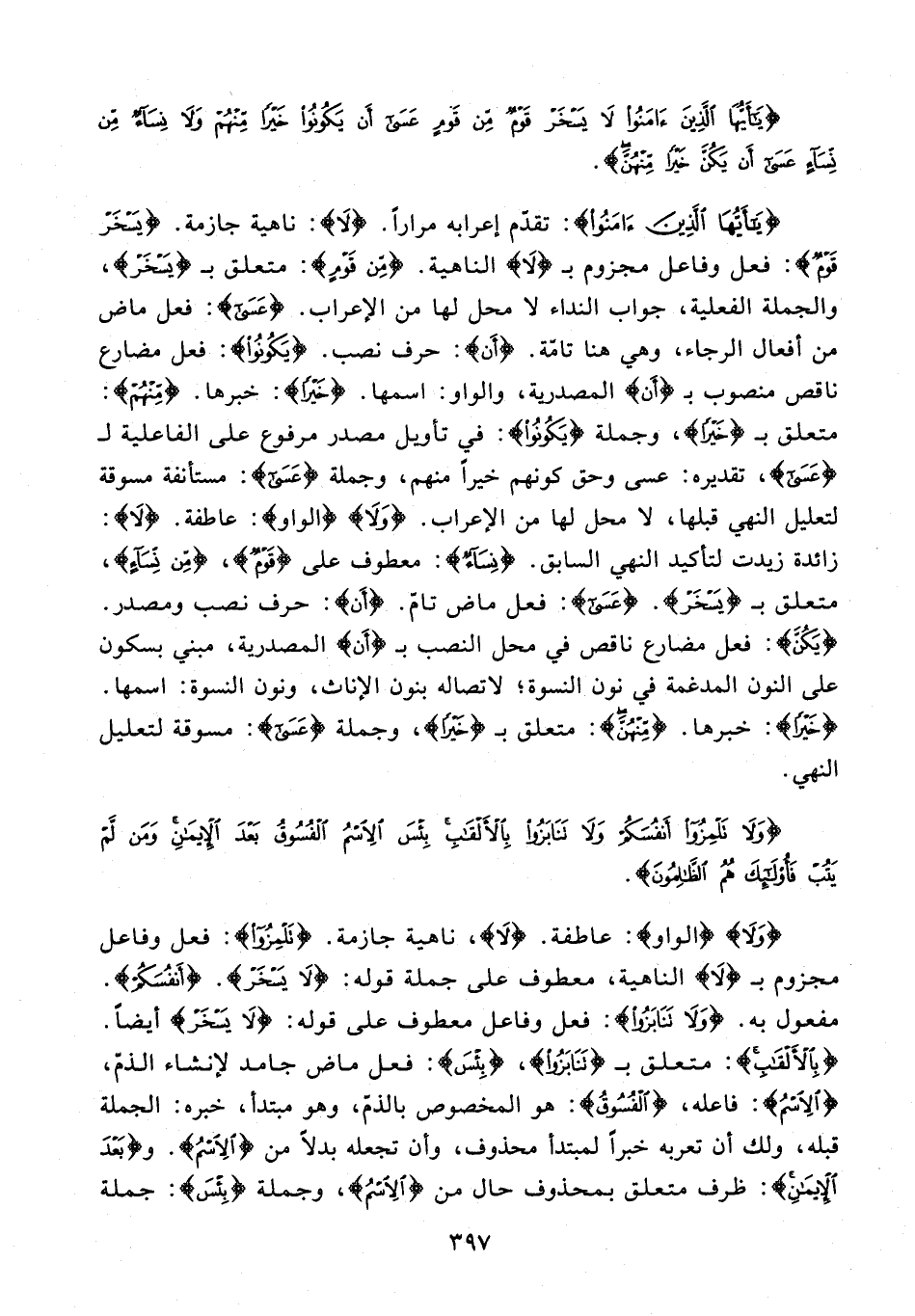 {يَا أَيُّهَا الَّذِينَ آمَنُوا}: تقدَّم إعرابه مرارًا. {لَا}: ناهية جازمة. {يَسْخَرْ قَوْمٌ}: فعل وفاعل مجزوم بـ {لَا} الناهية. {مِنْ قَوْمٍ}: متعلق بـ {يَسْخَرْ}، والجملة الفعلية، جواب النداء لا محل لها من الإعراب. {عَسَى}: فعل ماض من أفعال الرجاء، وهي هنا تامَّة. {أَن}: حرف نصب. {يَكُونُوا}: فعل مضارع ناقص منصوب بـ {أَن} المصدرية، والواو: اسمها. {خَيْرًا}: خبرها. {مِنْهُمْ}: متعلق بـ {خَيْرًا}، وجملة {يَكُونُوا}: في تأويل مصدر مرفوع على الفاعلية لـ {عَسَى}، تقديره: عسى وحق كونهم خيرًا منهم، وجملة {عَسَى}: مستأنفة مسوقة لتعليل النهي قبلها، لا محل لها من الإعراب. {وَلَا} {الواو}؛ عاطفة. {لَا}: زائدة زيدت لتأكيد النهي السابق. {نِسَاءٌ}: معطوف على {قَوْمٍ}، {مِنْ نِسَاءٍ}، متعلق بـ {يَسْخَرْ}. {عَسَى}: فعل ماض تامّ. {أَن}: حرف نصب ومصدر. {يَكُنَّ}: فعل مضارع ناقص في محل النصب بـ {أَن} المصدرية، مبني بسكون على النون المدغمة في نون النسوة؛ لاتصاله بنون الإناث، ونون النسوة: اسمها، {خَيْرًا}: خبرها. {مِنْهُنَّ}: متعلق بـ {خَيْرًا}، وجملة {عَسَى}: مسوقة لتعليل النهي.