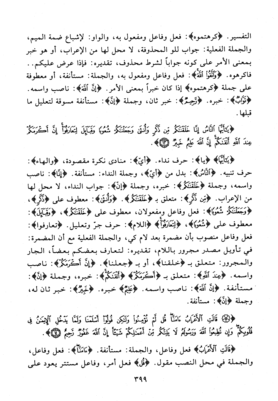 {يَا أَيُّهَا} {يا}: حرف نداء. {أيّ}: منادى نكرة مقصودة، {والهاء}: حرف تنبيه. {النَّاسُ}: بدل من {أيّ}، وجملة النداء: مستأنفة. {إِنَّا}: ناصب واسمه، وجملة {خَلَقْنَاكُمْ}: خبره، وجملة {إنّ}: جواب النداء، لا محل لها من الإعراب. {مِنْ ذَكَرٍ}: متعلق بـ {خَلَقْنَاكُمْ}. {وَأُنْثَى}: معطوف على {ذَكَرٍ}، {وَجَعَلْنَاكُمْ شُعُوبًا}: فعل وفاعل ومفعولان، معطوف على {خَلَقْنَاكُمْ}، {وَقَبَائِلَ}: معطوف على {شُعُوبًا}، {لِتَعَارَفُوا} {اللام}: حرف جرّ وتعليل. {تَعَارَفُوا}: فعل وفاعل منصوب بأن مضمرة بعد لام كي، والجملة الفعلية مع أن المضمرة: في تأويل مصدر مجرور باللام، تقديره: لتعارف بعضكم بعضًا، الجار والمجرور: متعلق بـ {خَلَقْنَا}، أو بـ {جعلنا}. {إِنَّ أَكْرَمَكُمْ}: ناصب واسمه. {عِنْدَ اللَّهِ}: متعلق بـ {أَكْرَمَكُمْ} {أَتْقَاكُمْ}: خبره، وجملة {إنَّ}: مستأنفة. {إِنَّ اللَّهَ}: ناصب واسمه. {عَلِيمٌ} خبره. {خَبِيرٌ}: خبر ثان له، وجملة {إِنَّ}: مستأنفة.