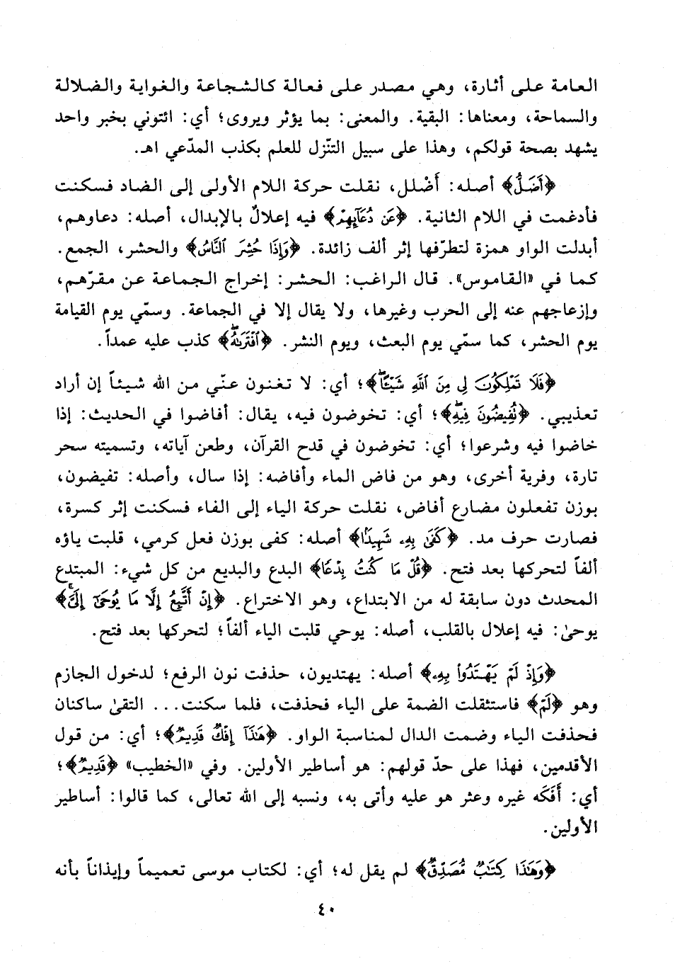 {فَلَا تَمْلِكُونَ لِي مِنَ اللَّهِ شَيْئًا}؛ أي: لا تغنون عنّي من الله شيئًا إن أراد تعذيبي. {تُفِيضُونَ فِيهِ}؛ أي: تخوضون فيه، يقال: أفاضوا في الحديث: إذا خاضوا فيه وشرعوا؛ أي: تخوضون في قدح القرآن، وطعن آياته، وتسميته سحر تارة، وفرية أخرى، وهو من فاض الماء وأفاضه: إذا سال، وأصله: تفيضون، بوزن تفعلون مضارع أفاض، نقلت حركة الياء إلى الفاء فسكنت إثر كسرة، فصارت حرف مد. {كَفَى بِهِ شَهِيدًا} أصله: كفى بوزن فعل كرمي، قلبت ياؤه ألفًا لتحركها بعد فتح. {قُلْ مَا كُنْتُ بِدْعًا} البدع والبديع من كل شيء: المبتدع المحدث دون سابقة له من الابتداع، وهو الاختراع. {إِنْ أَتَّبِعُ إِلَّا مَا يُوحَى إِلَيَّ} يوحى: فيه إعلال بالقلب، أصله: يوحي قلبت الياء ألفًا؛ لتحركها بعد فتح.