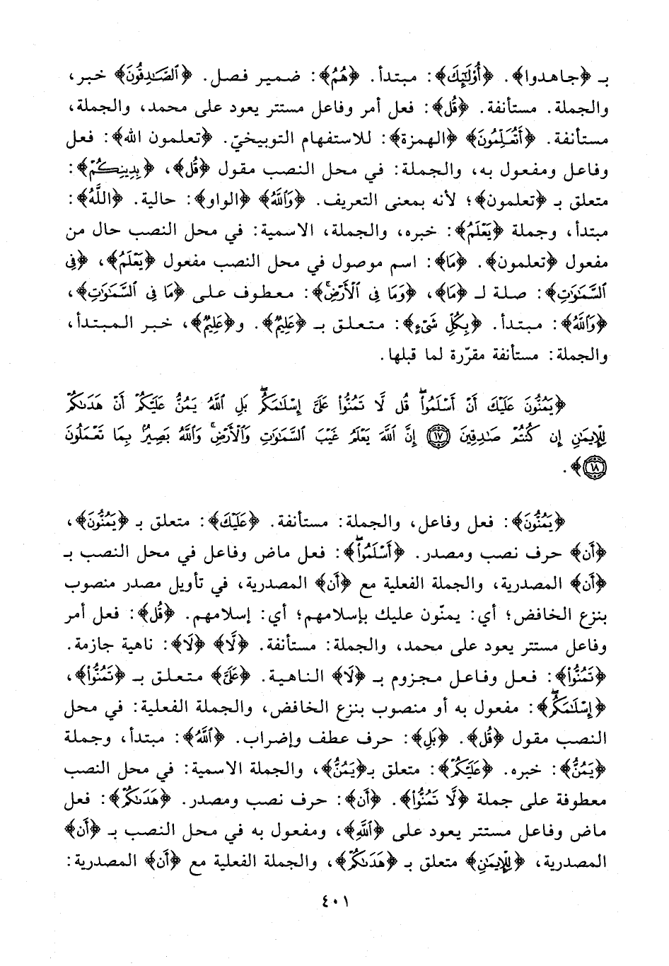 {يَمُنُّونَ}: فعل وفاعل، والجملة: مستأنفة. {عَلَيْكَ}: متعلق بـ {يَمُنُّونَ}، {أَن} حرف نصب ومصدر. {أَسْلَمُوا}: فعل ماض وفاعل في محل النصب بـ {أَن} المصدرية، والجملة الفعلية مع {أَن} المصدرية، في تأويل مصدر منصوب بنزع الخافض؛ أي: يمنّون عليك بإسلامهم؛ أي: إسلامهم. {قُل}: فعل أمر وفاعل مستتر يعود على محمد، والجملة: مستأنفة. {لَا} {لَا}: ناهية جازمة. {تَمُنُّوا}: فعل وفاعل مجزوم بـ {لَا} الناهية. {عَلَيَّ} متعلق بـ {تَمُنُّوا}، {إِسْلَامَكُمْ}: مفعول به أو منصوب بنزع الخافض، والجملة الفعلية: في محل النصب مقول {قُل}. {بَلِ}: حرف عطف وإضراب. {اللَّهُ}: مبتدأ، وجملة {يَمُنُّ}: خبره. {عَلَيْكُمْ}: متعلق بـ {يَمُنُّ}، والجملة الاسمية: في محل النصب معطوفة على جملة {لَا تَمُنُّوا}. {أَن}: حرف نصب ومصدر. {هَدَاكُمْ}: فعل ماض وفاعل مستتر يعود على {اللَّهُ}، ومفعول به في محل النصب بـ {أَن} المصدرية، {لِلْإِيمَانِ} متعلق بـ {هَدَاكُمْ}، والجملة الفعلية مع {أَن} المصدرية: