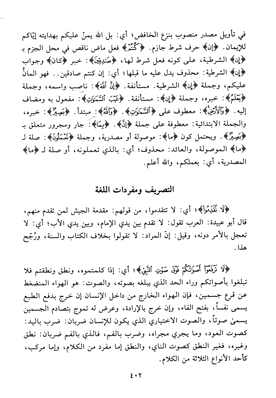 {لَا تَرْفَعُوا أَصْوَاتَكُمْ فَوْقَ صَوْتِ النَّبِيِّ}؛ أي: إذا كلمتموه، ونطق ونطقتم فلا تبلغوا بأصواتكم وراء الحد الذي يبلغه بصوته، والصوت: هو الهواء المنضغط عن قرع جسمين، فإن الهواء الخارج من داخل الإنسان إن خرج بدفع الطبع يسمى نفسًا، بفتح الفاء، وإن خرج بالإرادة، وعرض له تموج بتصادم الجسمين يسمى صوتًا، والصوت الاختياري الذي يكون للإنسان ضربان: ضرب باليد: كصوت العود، وما يجري مجراه، وضرب بالفم، فالذي بالفم ضربان: نطق وغيره، فغير النطق كصوت الناي، والنطق إما مفرد من الكلام، وإما مركب، كأحد الأنواع الثلاثة من الكلام.