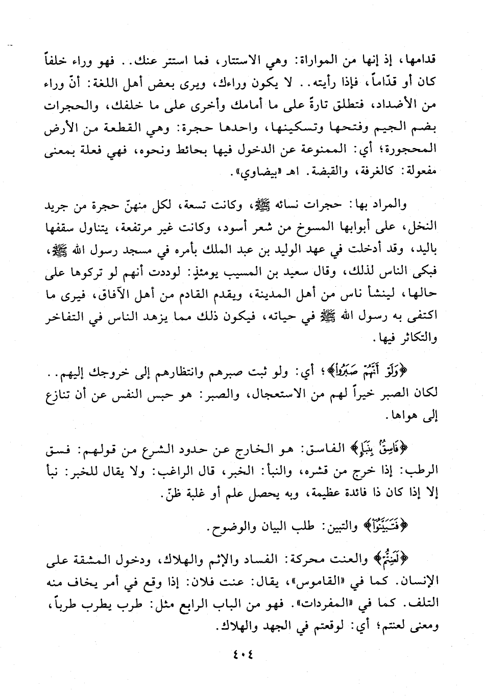 قدامها، إذ إنها من المواراة: وهي الاستتار، فما استتر عنك .. فهو وراء خلفًا كان أو قدّامًا، فإذا رأيته .. لا يكون وراءك، ويرى بعض أهل اللغة: أنّ وراء من الأضداد، فتطلق تارةً على ما أمامك وأخرى على ما خلفك، والحجرات بضم الجيم وفتحها وتسكينها، واحدها حجرة: وهي القطعة من الأرض المحجورة؛ أي: الممنوعة عن الدخول فيها بحائط ونحوه، فهي فعلة بمعنى مفعولة: كما لغرفة، والقبضة. اهـ "بيضاوي".