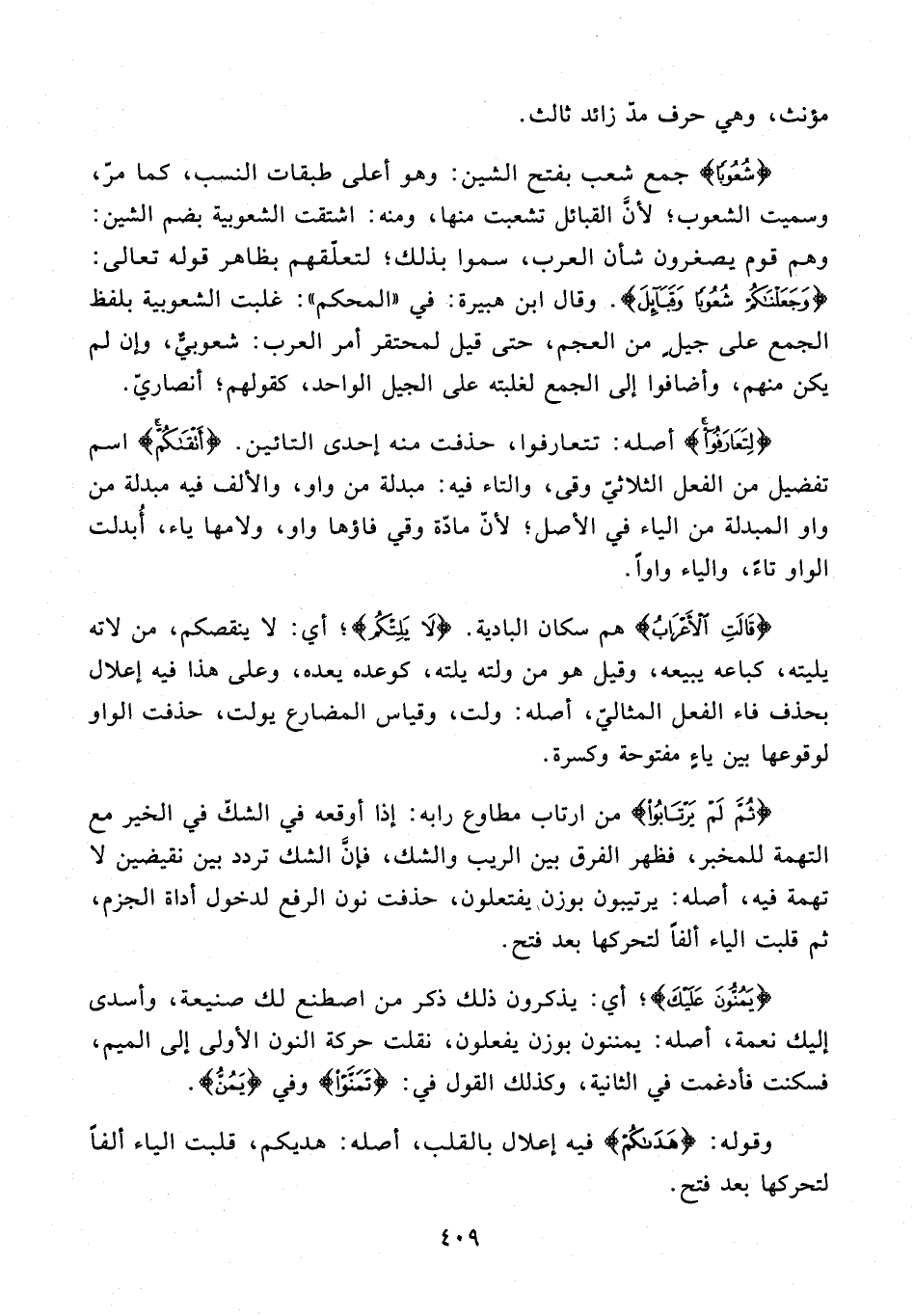 {لِتَعَارَفُوا} أصله: تتعارفوا، حذفت منه إحدى التائين. {أَتْقَاكُمْ} اسم تفضيل من الفعل الثلاثي وقى، والتاء فيه: مبدلة من واو، والألف فيه مبدلة من واو المبدلة من الياء في الأصل؛ لأنّ مادّة وفي فاؤها واو، ولامها ياء، أُبدلت الواو تاءً، والياء واوًا.