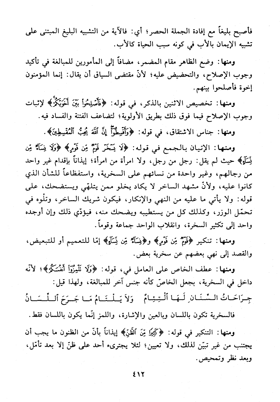 ومنها: تنكير {قَوْمٌ مِنْ قَوْمٍ} و {وَلَا نِسَاءٌ مِنْ نِسَاءٍ} إمّا للتعميم أو للتبعيض، والقصد إلى نهي بعضهم عن سخرية بعض.