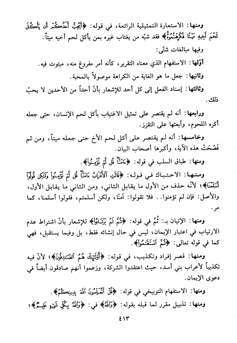ومنها: الاستعارة التمثيلية الرائعة، في قوله: {أَيُحِبُّ أَحَدُكُمْ أَنْ يَأْكُلَ لَحْمَ أَخِيهِ مَيْتًا فَكَرِهْتُمُوهُ} فقد شبَّه من يغتاب غيره بمن يأكل لحم أخيه ميتًا.