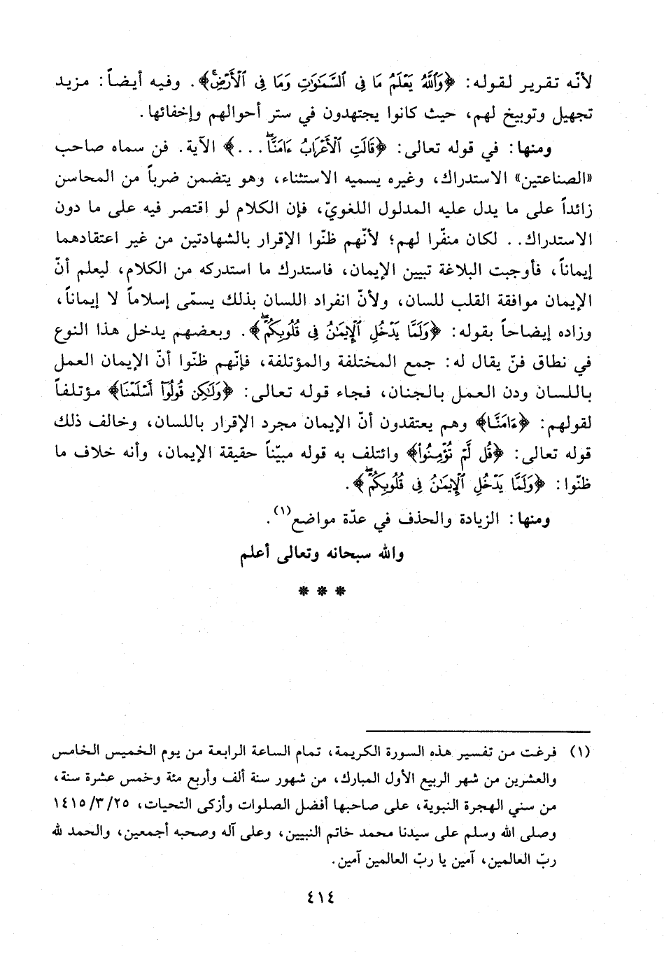(¬1) فرغت من تفسير هذه السورة الكريمة، تمام الساعة الرابعة من يوم الخميس الخامس والعشرين من شهر الربيع الأول المبارك، من شهور سنة ألف وأربع مئة وخمس عشرة سنة، من سني الهجرة النبوية، على صاحبها أفضل الصلوات وأزكى التحيات، 25/ 3/ 1415 وصلى الله وسلم على سيدنا محمد خاتم النبيين، وعلى آله وصحبه أجمعين، والحمد لله ربّ العالمين، آمين يا ربّ العالمين آمين.