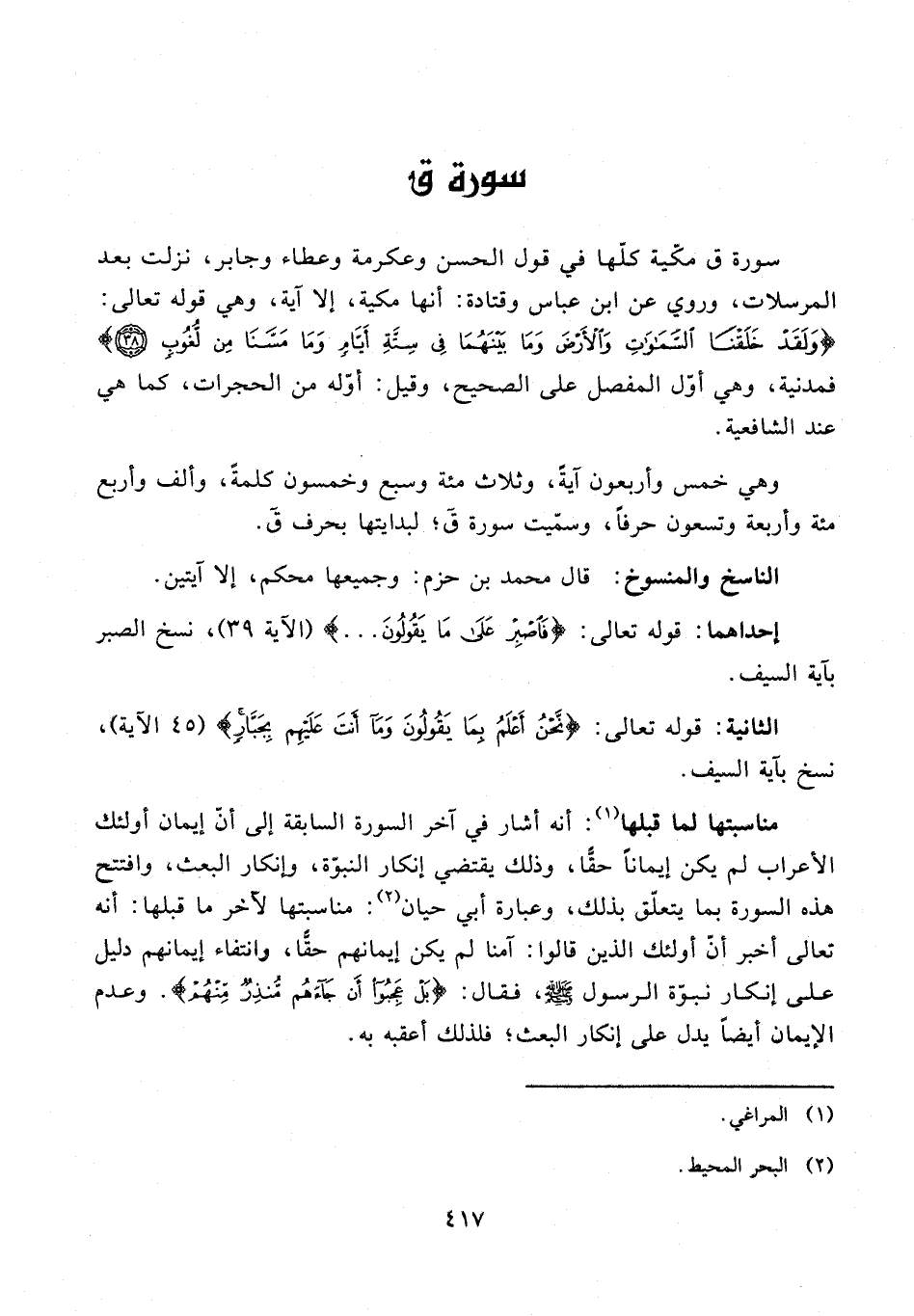 الثانية: قوله تعالى: {نَحْنُ أَعْلَمُ بِمَا يَقُولُونَ وَمَا أَنْتَ عَلَيْهِمْ بِجَبَّارٍ} (45 الآية)، نسخ بآية السيف.