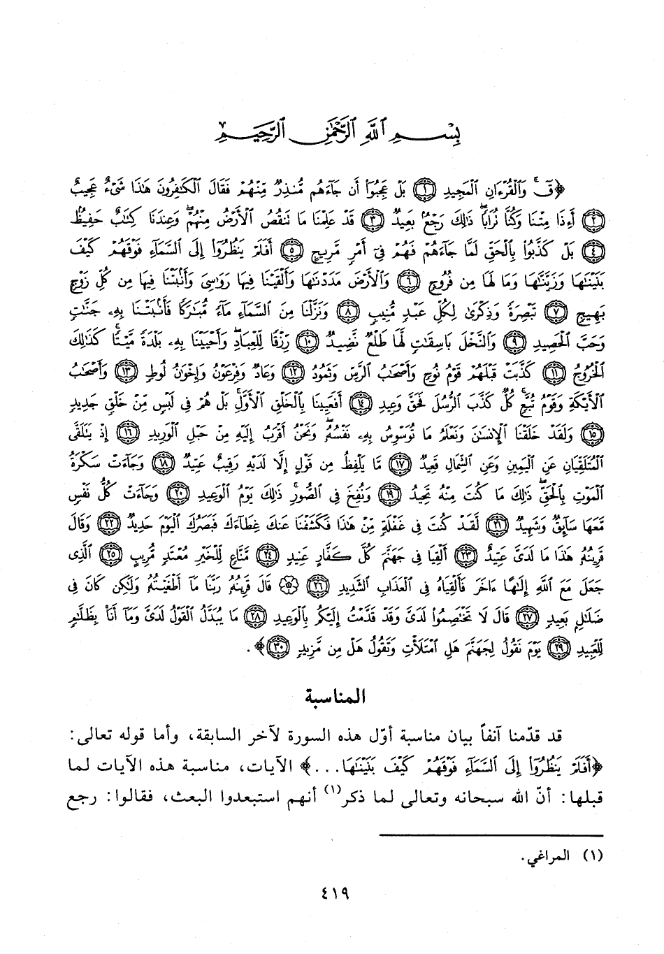 {ق وَالْقُرْآنِ الْمَجِيدِ (1) بَلْ عَجِبُوا أَنْ جَاءَهُمْ مُنْذِرٌ مِنْهُمْ فَقَالَ الْكَافِرُونَ هَذَا شَيْءٌ عَجِيبٌ (2) أَإِذَا مِتْنَا وَكُنَّا تُرَابًا ذَلِكَ رَجْعٌ بَعِيدٌ (3) قَدْ عَلِمْنَا مَا تَنْقُصُ الْأَرْضُ مِنْهُمْ وَعِنْدَنَا كِتَابٌ حَفِيظٌ (4) بَلْ كَذَّبُوا بِالْحَقِّ لَمَّا جَاءَهُمْ فَهُمْ فِي أَمْرٍ مَرِيجٍ (5) أَفَلَمْ يَنْظُرُوا إِلَى السَّمَاءِ فَوْقَهُمْ كَيْفَ بَنَيْنَاهَا وَزَيَّنَّاهَا وَمَا لَهَا مِنْ فُرُوجٍ (6) وَالْأَرْضَ مَدَدْنَاهَا وَأَلْقَيْنَا فِيهَا رَوَاسِيَ وَأَنْبَتْنَا فِيهَا مِنْ كُلِّ زَوْجٍ بَهِيجٍ (7) تَبْصِرَةً وَذِكْرَى لِكُلِّ عَبْدٍ مُنِيبٍ (8) وَنَزَّلْنَا مِنَ السَّمَاءِ مَاءً مُبَارَكًا فَأَنْبَتْنَا بِهِ جَنَّاتٍ وَحَبَّ الْحَصِيدِ (9) وَالنَّخْلَ بَاسِقَاتٍ لَهَا طَلْعٌ نَضِيدٌ (10) رِزْقًا لِلْعِبَادِ وَأَحْيَيْنَا بِهِ بَلْدَةً مَيْتًا كَذَلِكَ الْخُرُوجُ (11) كَذَّبَتْ قَبْلَهُمْ قَوْمُ نُوحٍ وَأَصْحَابُ الرَّسِّ وَثَمُودُ (12) وَعَادٌ وَفِرْعَوْنُ وَإِخْوَانُ لُوطٍ (13) وَأَصْحَابُ الْأَيْكَةِ وَقَوْمُ تُبَّعٍ كُلٌّ كَذَّبَ الرُّسُلَ فَحَقَّ وَعِيدِ (14) أَفَعَيِينَا بِالْخَلْقِ الْأَوَّلِ بَلْ هُمْ فِي لَبْسٍ مِنْ خَلْقٍ جَدِيدٍ (15) وَلَقَدْ خَلَقْنَا الْإِنْسَانَ وَنَعْلَمُ مَا تُوَسْوِسُ بِهِ نَفْسُهُ وَنَحْنُ أَقْرَبُ إِلَيْهِ مِنْ حَبْلِ الْوَرِيدِ (16) إِذْ يَتَلَقَّى الْمُتَلَقِّيَانِ عَنِ الْيَمِينِ وَعَنِ الشِّمَالِ قَعِيدٌ (17) مَا يَلْفِظُ مِنْ قَوْلٍ إِلَّا لَدَيْهِ رَقِيبٌ عَتِيدٌ (18) وَجَاءَتْ سَكْرَةُ الْمَوْتِ بِالْحَقِّ ذَلِكَ مَا كُنْتَ مِنْهُ تَحِيدُ (19) وَنُفِخَ فِي الصُّورِ ذَلِكَ يَوْمُ الْوَعِيدِ (20) وَجَاءَتْ كُلُّ نَفْسٍ مَعَهَا سَائِقٌ وَشَهِيدٌ (21) لَقَدْ كُنْتَ فِي غَفْلَةٍ مِنْ هَذَا فَكَشَفْنَا عَنْكَ غِطَاءَكَ فَبَصَرُكَ الْيَوْمَ حَدِيدٌ (22) وَقَالَ قَرِينُهُ هَذَا مَا لَدَيَّ عَتِيدٌ (23) أَلْقِيَا فِي جَهَنَّمَ كُلَّ كَفَّارٍ عَنِيدٍ (24) مَنَّاعٍ لِلْخَيْرِ مُعْتَدٍ مُرِيبٍ (25) الَّذِي جَعَلَ مَعَ اللَّهِ إِلَهًا آخَرَ فَأَلْقِيَاهُ فِي الْعَذَابِ الشَّدِيدِ (26) قَالَ قَرِينُهُ رَبَّنَا مَا أَطْغَيْتُهُ وَلَكِنْ كَانَ فِي ضَلَالٍ بَعِيدٍ (27) قَالَ لَا تَخْتَصِمُوا لَدَيَّ وَقَدْ قَدَّمْتُ إِلَيْكُمْ بِالْوَعِيدِ (28) مَا يُبَدَّلُ الْقَوْلُ لَدَيَّ وَمَا أَنَا بِظَلَّامٍ لِلْعَبِيدِ (29) يَوْمَ نَقُولُ لِجَهَنَّمَ هَلِ امْتَلَأْتِ وَتَقُولُ هَلْ مِنْ مَزِيدٍ (30)}.
