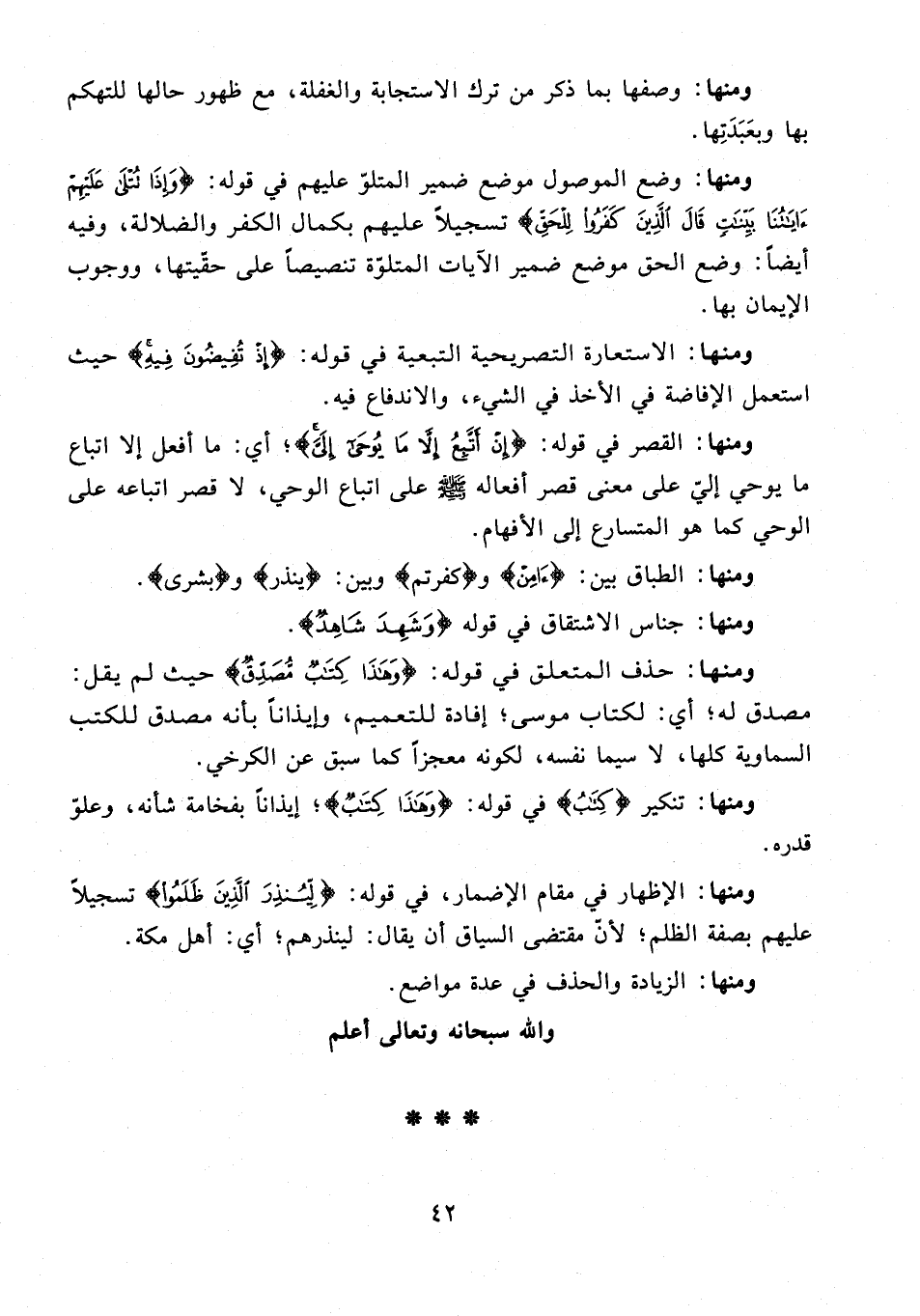 ومنها: القصر في قوله: {إِنْ أَتَّبِعُ إِلَّا مَا يُوحَى إِلَيَّ}؛ أي: ما أفعل إلا اتباع ما يوحي إليّ على معنى قصر أفعاله - صلى الله عليه وسلم - على اتباع الوحي، لا قصر اتباعه على الوحي كما هو المتسارع إلى الأفهام.