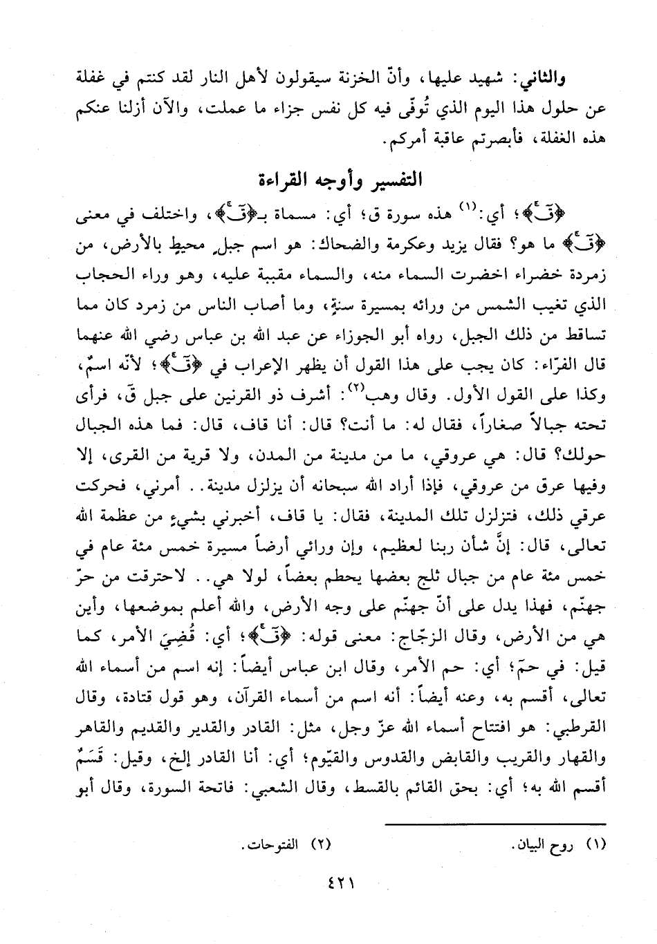 1 - {ق}؛ أي: (¬1) هذه سورة ق؛ أي: مسماة بـ {ق}، واختلف في معنى {ق} ما هو؟ فقال يزيد وعكرمة والضحاك: هو اسم جبلٍ محيطٍ بالأرض، من زمردة خضراء اخضرت السماء منه، والسماء مقببة عليه، وهو وراء الحجاب الذي تغيب الشمس من ورائه بمسيرة سنةٍ وما أصاب الناس من زمرد كان مما تساقط من ذلك الجبل، رواه أبو الجوزاء عن عبد الله بن عباس رضي الله عنهما قال الفرّاء: كان يجب على هذا القول أن يظهر الإعراب في {ق}؛ لأنّه اسمٌ، وكذا على القول الأول. وقال وهب (¬2): أشرف ذو القرنين على جبل ق، فرأى تحته جبالًا صغارًا، فقال له: ما أنت؟ قال: أنا قاف، قال: فما هذه الجبال حولك؟ قال: هي عروقي، ما من مدينة من المدن، ولا قرية من القرى، إلا وفيها عرق من عروقي، فإذا أراد الله سبحانه أن يزلزل مدينة .. أمرني، فحركت عرقي ذلك، فتزلزل تلك المدينة، فقال: يا قاف، أخبرني بشيءٍ من عظمة الله تعالى، قال: إنَّ شأن ربنا لعظيم، وإن ورائي أرضًا مسيرة خمس مئة عام في خمس مئة عام من جبال ثلج بعضها يحطم بعضًا، لولا هي .. لاحترقت من حرّ جهنّم، فهذا يدل على أنّ جهنّم على وجه الأرض، والله أعلم بموضعها، وأين هي من الأرض، وقال الزجّاج: معنى قوله: {ق}؛ أي: قُضِيَ الأمر، كما قيل: في حم؛ أي: حم الأمر، وقال ابن عباس أيضًا: إنه اسم من أسماء الله تعالى، أقسم به، وعنه أيضًا: أنه اسم من أسماء القرآن، وهو قول قتادة، وقال القرطبي: هو افتتاح أسماء الله عزّ وجل، مثل: القادر والقدير والقديم والقاهر والقهار والقريب والقابض والقدوس والقيّوم؛ أي: أنا القادر إلخ، وقيل: قَسَمٌ أقسم الله به؛ أي: بحق القائم بالقسط، وقال الشعبي: فاتحة السورة، وقال أبو