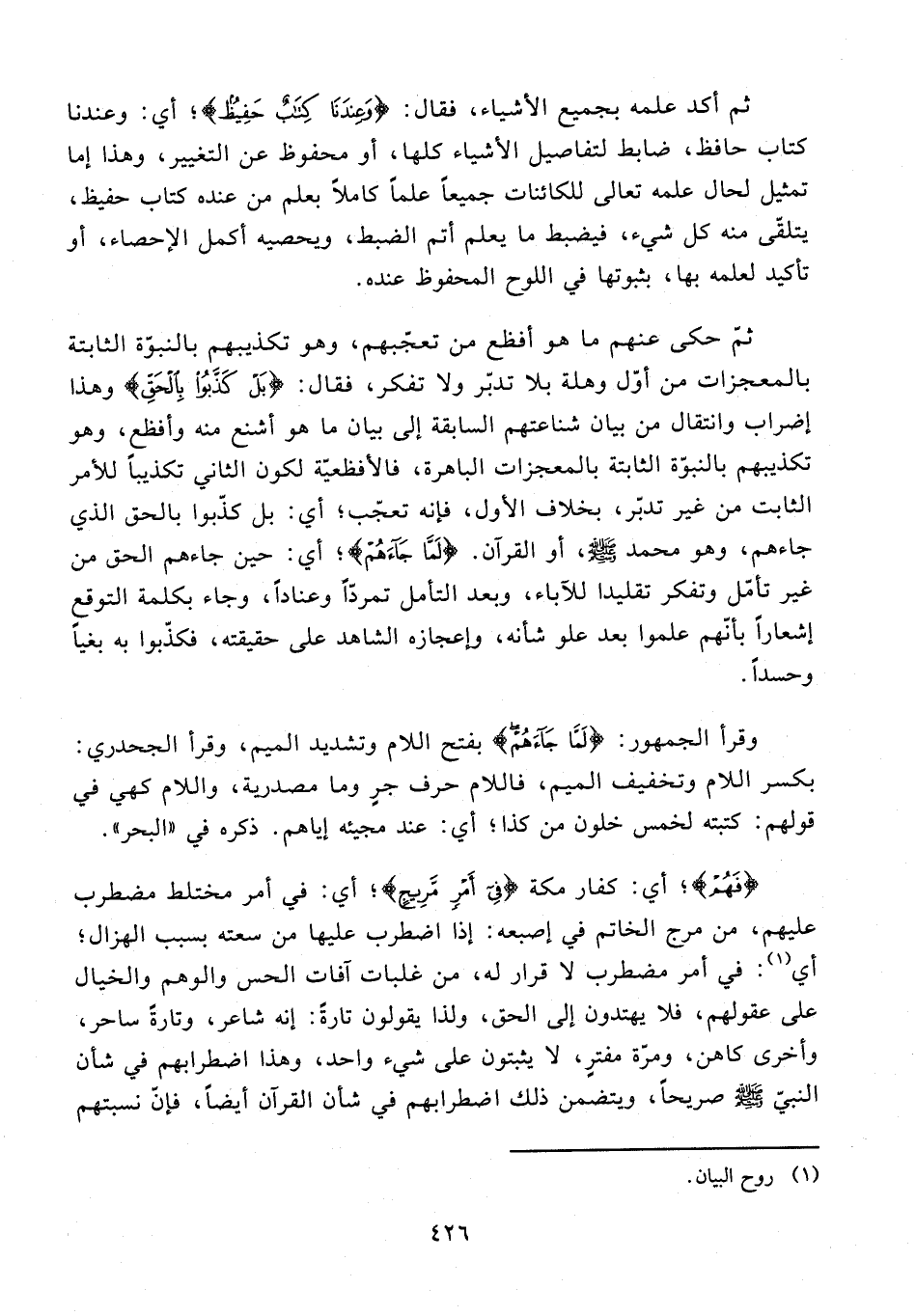 5 - ثمّ حكى عنهم ما هو أفظع من تعجّبهم، وهو تكذيبهم بالنبوّة الثابتة بالمعجزات من أوّل وهلة بلا تدبّر ولا تفكر، فقال: {بَلْ كَذَّبُوا بِالْحَقِّ} وهذا إضراب وانتقال من بيان شناعتهم السابقة إلى بيان ما هو أشنع منه وأفظع، وهو تكذيبهم بالنبوّة الثابتة بالمعجزات الباهرة، فالأفظعيّة لكون الثاني تكذيبًا للأمر الثابت من غير تدبّر، بخلاف الأول، فإنه تعجّب؛ أي: بل كذّبوا بالحق الذي جاءهم، وهو محمد - صلى الله عليه وسلم -، أو القرآن. {لَمَّا جَاءَهُمْ}؛ أي: حين جاءهم الحق من غير تأمّل وتفكر تقليدا للآباء، وبعد التأمل تمردًّا وعنادًا، وجاء بكلمة التوقع إشعارًا بأنّهم علموا بعد علو شأنه، وإعجازه الشاهد على حقيقته، فكذّبوا به بغيًا وحسدًا.