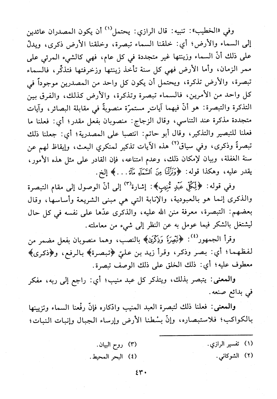 وفي "الخطيب": تنبيه: قال الرازي: يحتمل (¬1) أن يكون المصدران عائدين إلى السماء والأرض؛ أي: خلقنا السماء تبصرة، وخلقنا الأرض ذكرى، ويدلّ على ذلك أنّ السماء وزينتها غير متجددة في كل عام، فهي كالشيء المرئي على ممر الزمان، وأما الأرض فهي كل سنة تأخذ زينتها وزخرفتها فتذكِّر، فالسماء تبصرة، والأرض تذكرة، ويحتمل أن يكون كل واحد من المصدرين موجودًا في كل واحد من الأمرين، فالسماء تبصرة وتذكرة، والأرض كذلك، والفرق بين التذكرة والتبصرة: هو أنّ فيهما آياتٍ مستمرّة منصوبةً في مقابلة البصائر، وآيات متجددة مذكرة عند التناسي، وقال الزجاج: منصوبان بفعل مقدر؛ أي: فعلنا ما فعلنا للتبصير والتذكير، وقال أبو حاتم: انتصبا على المصدرية؛ أي: جعلنا ذلك تبصرةً وذكرى، وفي سياق (¬2) هذه الآيات تذكير لمنكري البعث، وإيقاظ لهم عن سنة الغفلة، وبيان لإمكان ذلك، وعدم امتناعه، فإن القادر على مثل هذه الأمور، يقدر عليه، وهكذا قوله: {وَنَزَّلْنَا مِنَ السَّمَاءِ مَاءً ...} إلخ.