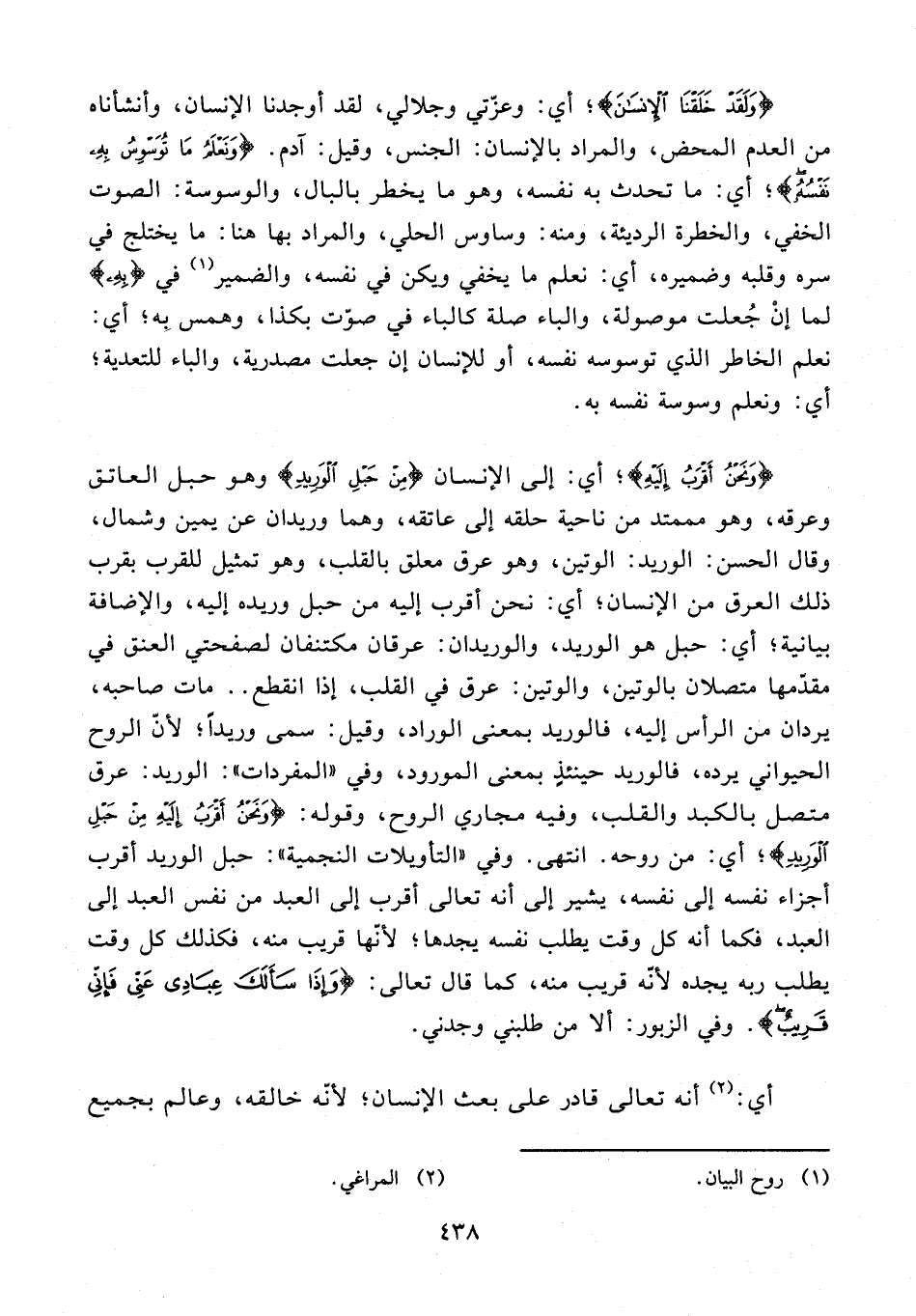 {وَنَحْنُ أَقْرَبُ إِلَيْهِ}؛ أي: إلى الإنسان {مِنْ حَبْلِ الْوَرِيدِ} وهو حبل العاتق وعرقه، وهو ممتد من ناحية حلقه إلى عاتقه، وهما وريدان عن يمين وشمال، وقال الحسن: الوريد: الوتين، وهو عرق معلق بالقلب، وهو تمثيل للقرب بقرب ذلك العرق من الإنسان؛ أي: نحن أقرب إليه من حبل وريده إليه، والإضافة بيانية؛ أي: حبل هو الوريد، والوريدان: عرقان مكتنفان لصفحتي العنق في مقدّمها متصلان بالوتين، والوتين: عرق في القلب، إذا انقطع .. مات صاحبه، يردان من الرأس إليه، فالوريد بمعنى الوراد، وقيل: سمى وريدًا؛ لأنّ الروح الحيواني يرده، فالوريد حينئذٍ بمعنى المورود، وفي "المفردات": الوريد: عرق متصل بالكبد والقلب، وفيه مجاري الروح، وقوله: {وَنَحْنُ أَقْرَبُ إِلَيْهِ مِنْ حَبْلِ الْوَرِيدِ}؛ أي: من روحه. انتهى. وفي "التأويلات النجمية": حبل الوريد أقرب أجزاء نفسه إلى نفسه، يشير إلى أنه تعالى أقرب إلى العبد من نفس العبد إلى العبد، فكما أنه كل وقت يطلب نفسه يجدها؛ لأنّها قريب منه، فكذلك كل وقت يطلب ربه يجده لأنّه قريب منه، كما قال تعالى: {وَإِذَا سَأَلَكَ عِبَادِي عَنِّي فَإِنِّي قَرِيبٌ}. وفي الزبور: ألا من طلبني وجدني.