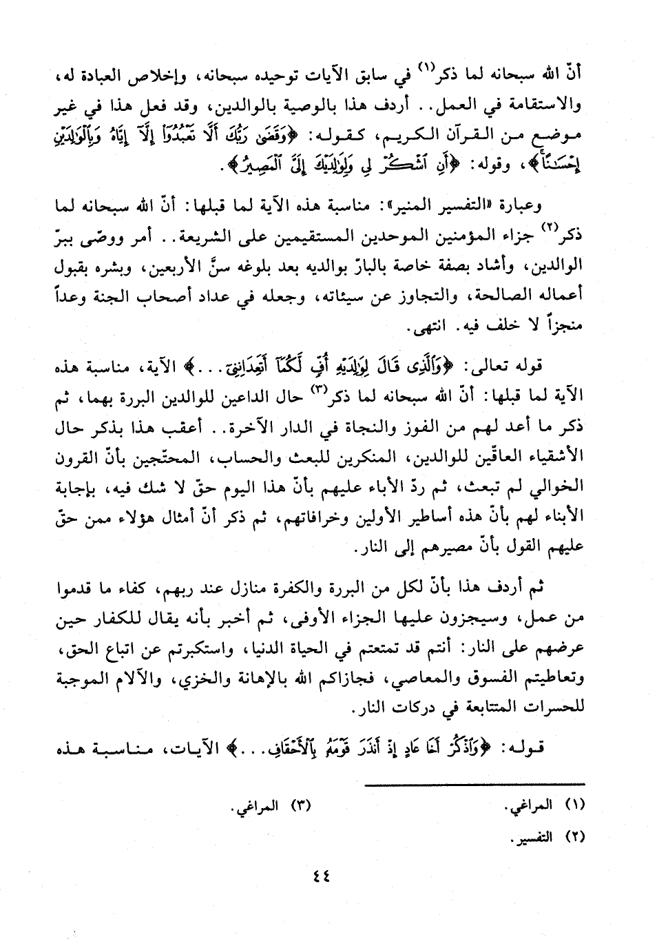 وعبارة "التفسير المنير": مناسبة هذه الآية لما قبلها: أنّ الله سبحانه لما ذكر (¬2) جزاء المؤمنين الموحدين المستقيمين على الشريعة .. أمر ووصّى ببرّ الوالدين، وأشاد بصفة خاصة بالبارّ بوالديه بعد بلوكه سنَّ الأربعين، وبشره بقبول أعماله الصالحة، والتجاوز عن سيئاته، وجعله في عداد أصحاب الجنة وعدًا منجزًا لا خلف فيه. انتهى.