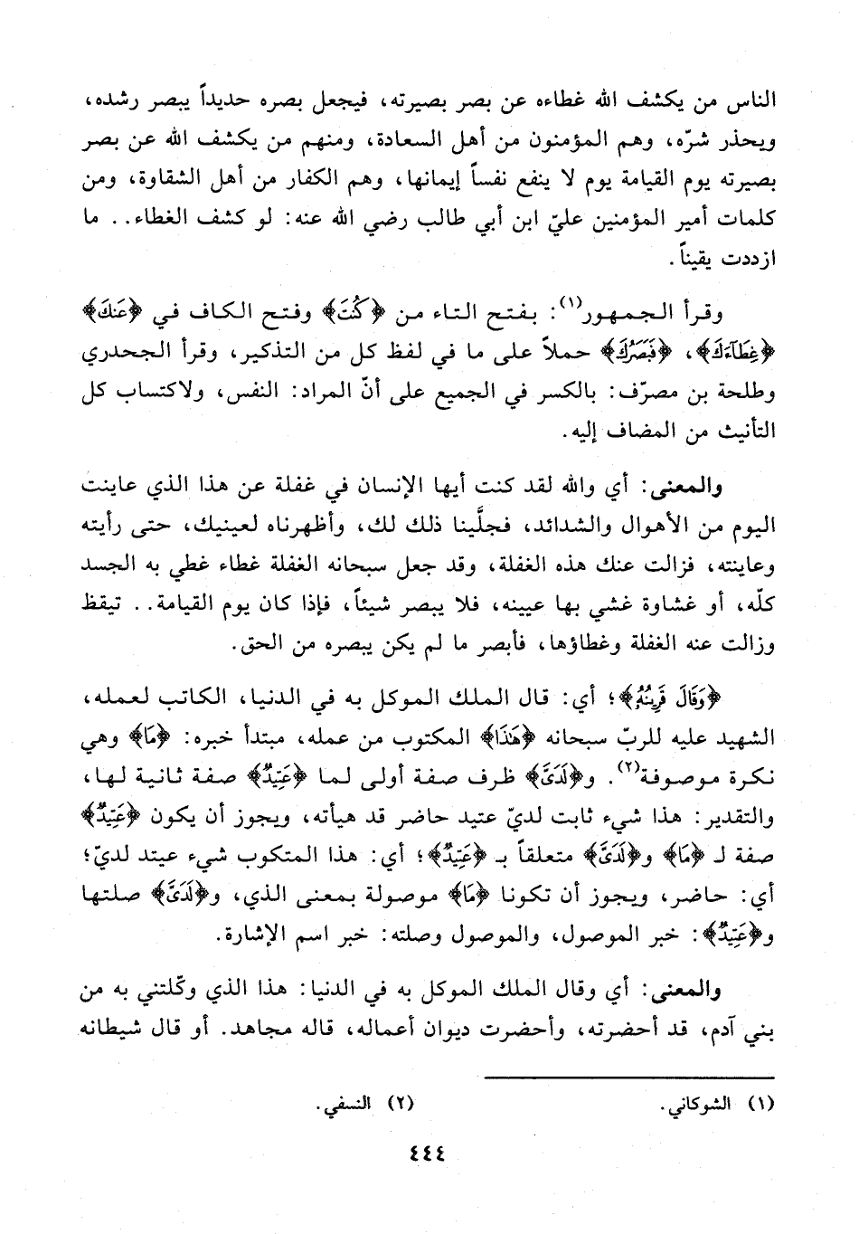 وقرأ الجمهور (¬1): بفتح التاء من {كُنْتَ} وفتح الكاف في {عَنْكَ} {غِطَاءَكَ}، {فَبَصَرُكَ} حملًا على ما في لفظ كل من التذكير، وقرأ الجحدري وطلحة بن مصرّف: بالكسر في الجميع على أنّ المراد: النفس، ولاكتساب كل التأنيث من المضاف إليه.