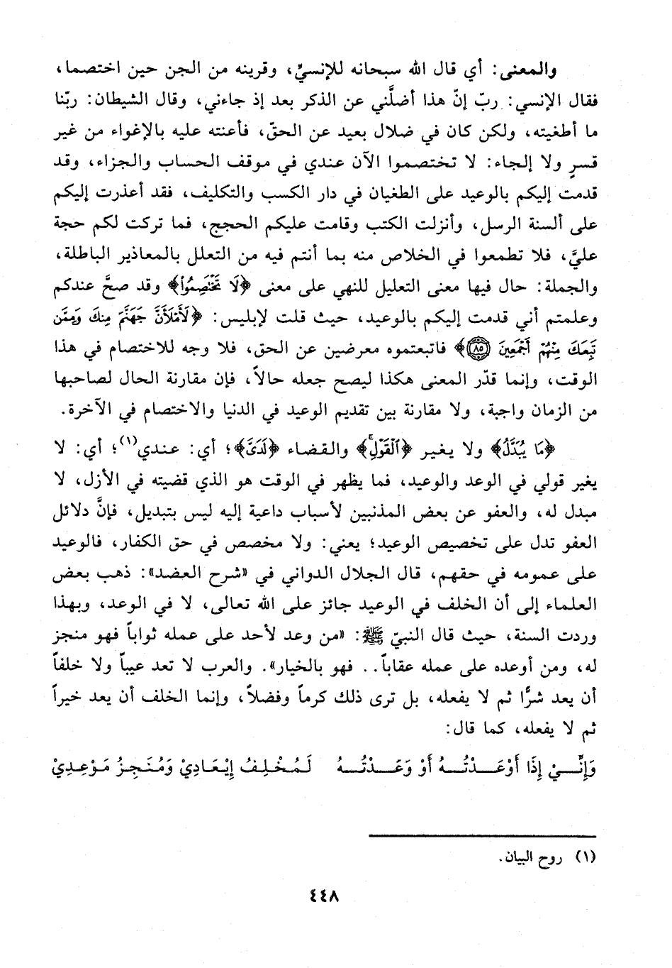 29 - {مَا يُبَدَّلُ} ولا يغير {الْقَوْلُ} والقضاء {لَدَيَّ}؛ أي: عندي (¬1)؛ أي: لا يغير قولي في الوعد والوعيد، فما يظهر في الوقت هو الذي قضيته في الأزل، لا مبدل له، والعفو عن بعض المذنبين لأسباب داعية إليه ليس بتبديل، فإنَّ دلائل العفو تدل على تخصيص الوعيد؛ يعني: ولا مخصص في حق الكفار، فالوعيد على عمومه في حقهم، قال الجلال الدواني في "شرح العضد": ذهب بعض العلماء إلى أن الخلف في الوعيد جائز على الله تعالى، لا في الوعد، وبهذا وردت السنة، حيث قال النبيّ - صلى الله عليه وسلم -: "من وعد لأحد على عمله ثوابًا فهو منجز له، ومن أوعده على عمله عقابًا .. فهو بالخيار". والعرب لا تعد عيبًا ولا خلفًا أن يعد شرًّا ثم لا يفعله، بل ترى ذلك كرمًا وفضلًا، وإنما الخلف أن يعد خيرًا ثم لا يفعله، كما قال: