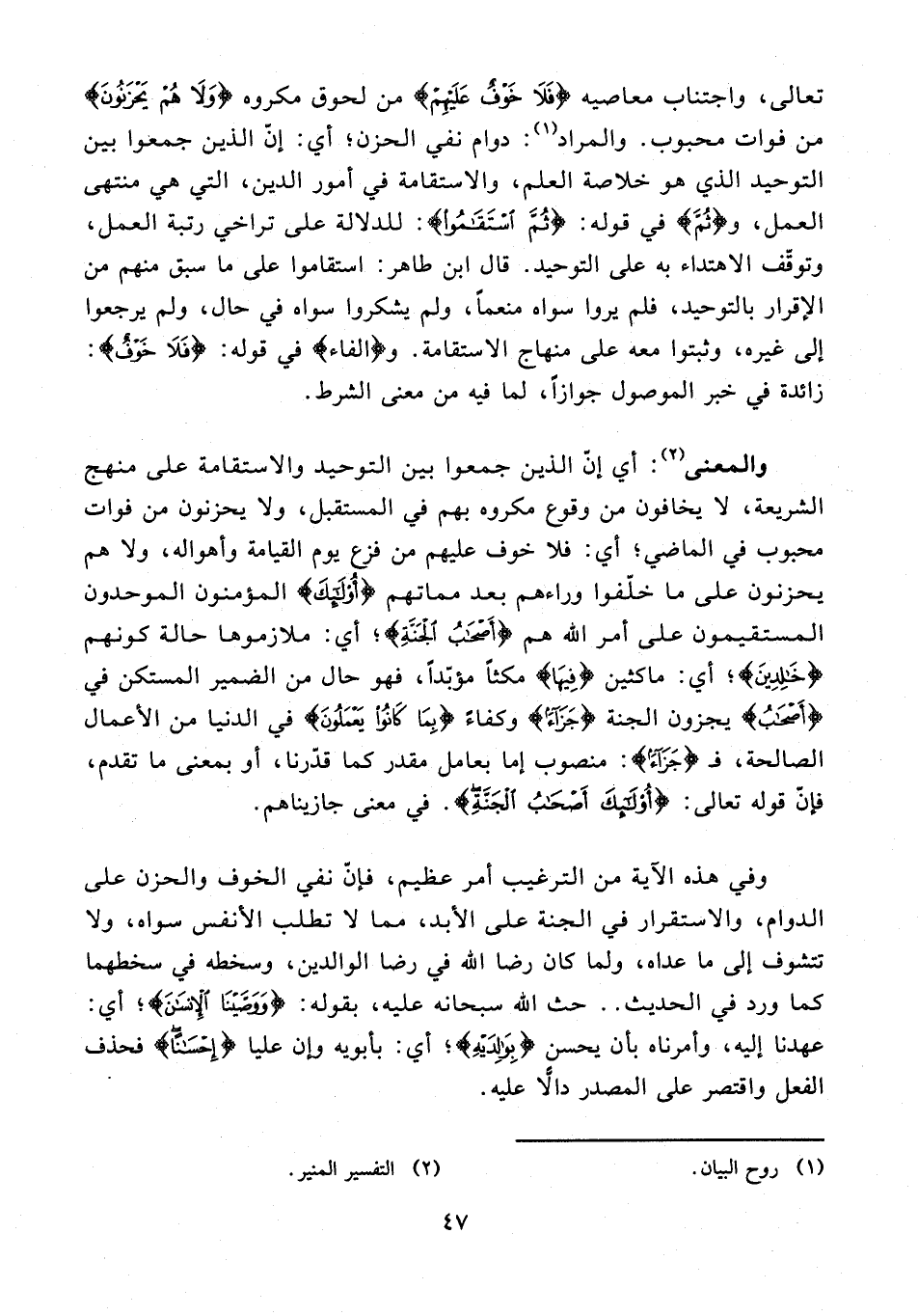 والمعنى (¬2): أي إنّ الذين جمعوا بين التوحيد والاستقامة على منهج الشريعة، لا يخافون من وقوع مكروه بهم في المستقبل، ولا يحزنون من فوات محبوب في الماضي؛ أي: فلا خوف عليهم من فزع يوم القيامة وأهواله، ولا هم يحزنون على ما خلّفوا وراءهم بعد مماتهم