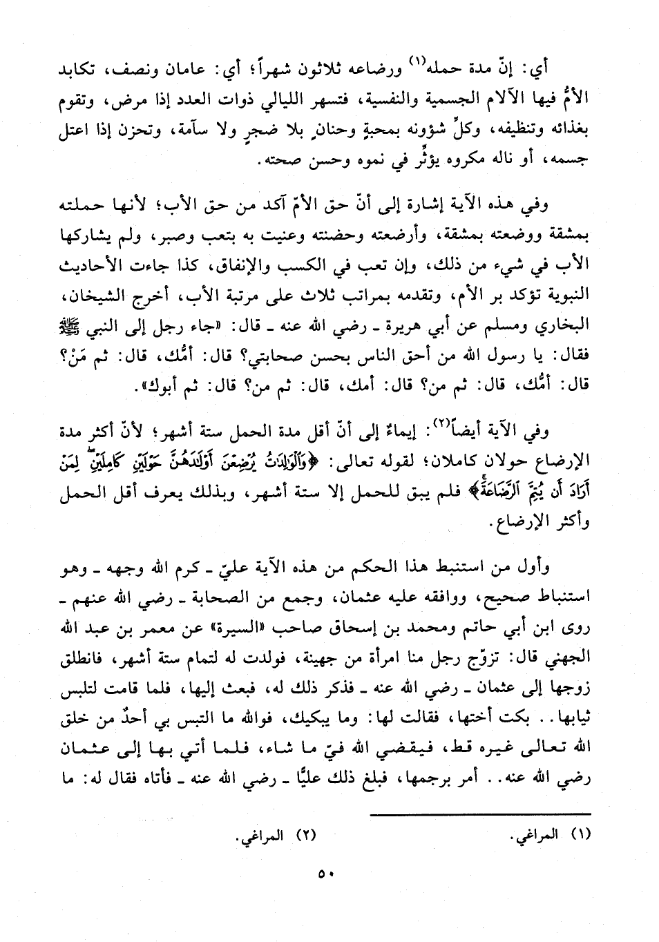 وفي الآية أيضًا (¬2): إيماءٌ إلى أنّ أقل مدة الحمل ستة أشهر؛ لأنّ أكثر مدة الإرضاع حولان كاملان؛ لقوله تعالى: {وَالْوَالِدَاتُ يُرْضِعْنَ أَوْلَادَهُنَّ حَوْلَيْنِ كَامِلَيْنِ لِمَنْ أَرَادَ أَنْ يُتِمَّ الرَّضَاعَةَ} فلم يبق للحمل إلا ستة أشهر، وبذلك يعرف أقل العمل وأكثر الإرضاع.
