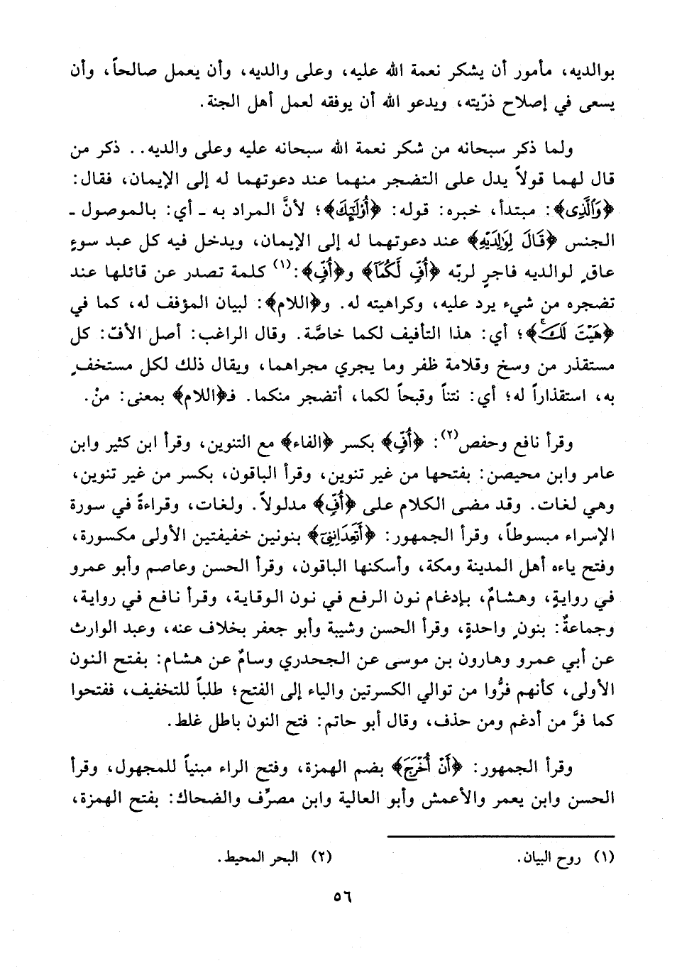 وقرأ نافع وحفص (¬2): {أُفٍّ} بكسر {الفاء} مع التنوين، وقرأ ابن كثير وابن عامر وابن محيصن: بفتحها من غير تنوين، وقرأ الباقون، بكسر من غير تنوين، وهي لغات. وقد مضى الكلام على {أُفٍّ} مدلولًا. ولغات، وقراءةً في سورة الإسراء مبسوطًا، وقرأ الجمهور: {أَتَعِدَانِنِي} بنونين خفيفتين الأولى مكسورة، وفتح ياءه أهل المدينة ومكة، وأسكنها الباقون، وقرأ الحسن وعاصم وأبو عمرو في روايةٍ، وهشامٌ، بإدغام نون الرفع في نون الوقاية، وقرأ نافع في رواية، وجماعةٌ: بنونٍ واحدةٍ، وقرأ الحسن وشيبة وأبو جعفر بخلاف عنه، وعبد الوارث عن أبي عمرو وهارون بن موسى عن الجحدري وسامٌ عن هشام: بفتح النون الأولى، كأنهم فرَّوا من توالي الكسرتين والياء إلى الفتح؛ طلبًا للتخفيف، ففتحوا كما فرَّ من أدغم ومن حذف، وقال أبو حاتم: فتح النون باطل غلط.