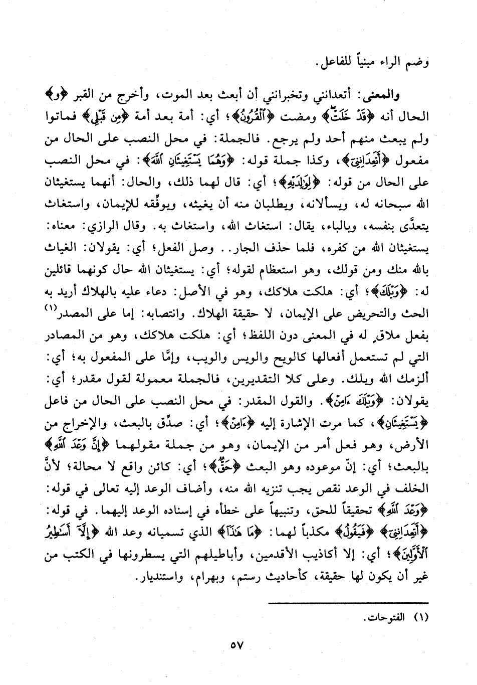 والمعنى: أتعدانني وتخبرانني أن أبعث بعد الموت، وأخرج من القبر {و} الحال أنه {قَدْ خَلَتِ} ومضت {الْقُرُونُ}؛ أي: أمة بعد أمة {مِنْ قَبْلِي} فماتوا ولم يبعث منهم أحد ولم يرجع. فالجملة: في محل النصب على الحال من مفعول {أَتَعِدَانِنِي}، وكذا جملة قوله: {وَهُمَا يَسْتَغِيثَانِ اللَّهَ}: في محل النصب على الحال من قوله: {لِوَالِدَيْه}؛ أي: قال لهما ذلك، والحال: أنهما يستغيثان الله سبحانه له، ويسألانه، ويطلبان منه أن يغيثه، ويوفقه للإيمان، واستغاث يتعدَّى بنفسه، وبالباء، يقال: استغاث الله، واستغاث به. وقال الرازي: معناه: يستغيثان الله من كفره، فلما حذف الجار .. وصل الفعل؛ أي: يقولان: الغياث بالله منك ومن قولك، وهو استعظام لقوله؛ أي: يستغيثان الله حال كونهما قائلين له: {وَيْلَكَ}؛ أي: هلكت هلاكك، وهو في الأصل: دعاء عليه بالهلاك أريد به الحث والتحريض على الإيمان، لا حقيقة الهلاك. وانتصابه: إما على المصدر (¬1) بفعل ملاقٍ له في المعنى دون اللفظ؛ أي: هلكت هلاكك، وهو من المصادر التي لم تستعمل أفعالها كالويح والويس والويب، وإمَّا على المفعول به؛ أي: ألزمك الله ويلك. وعلى كلا التقديرين، فالجملة معمولة لقول مقدر؛ أي: يقولان: {وَيْلَكَ آمِنْ}. والقول المقدر: في محل النصب على الحال من فاعل {يَسْتَغِيثَانِ}، كما مرت الإشارة إليه {آمِنْ}؛ أي: صدِّق بالبعث، والإخراج من الأرض، وهو فعل أمر من الإيمان، وهو من جملة مقولهما {إِنَّ وَعْدَ اللَّهِ} بالبعث؛ أي: إنّ موعوده وهو البعث {حَقٌّ}؛ أي: كائن واقع لا محالة؛ لأنَّ الخلف في الوعد نقص يجب تنزيه الله منه، وأضاف الوعد إليه تعالى في قوله: {وَعْدَ اللَّهِ} تحقيقًا للحق، وتنبيهًا على خطأه في إسناده الوعد إليهما. في قوله: {أَتَعِدَانِنِي} {فَيَقُولُ} مكذبًا لهما: {مَا هَذَا} الذي تسميانه وعد الله {إِلَّا أَسَاطِيرُ الْأَوَّلِينَ}؛ أي: إلا أكاذيب الأقدمين، وأباطيلهم التي يسطرونها في الكتب من غير أن يكون لها حقيقة، كأحاديث رستم، وبهرام، واستنديار.