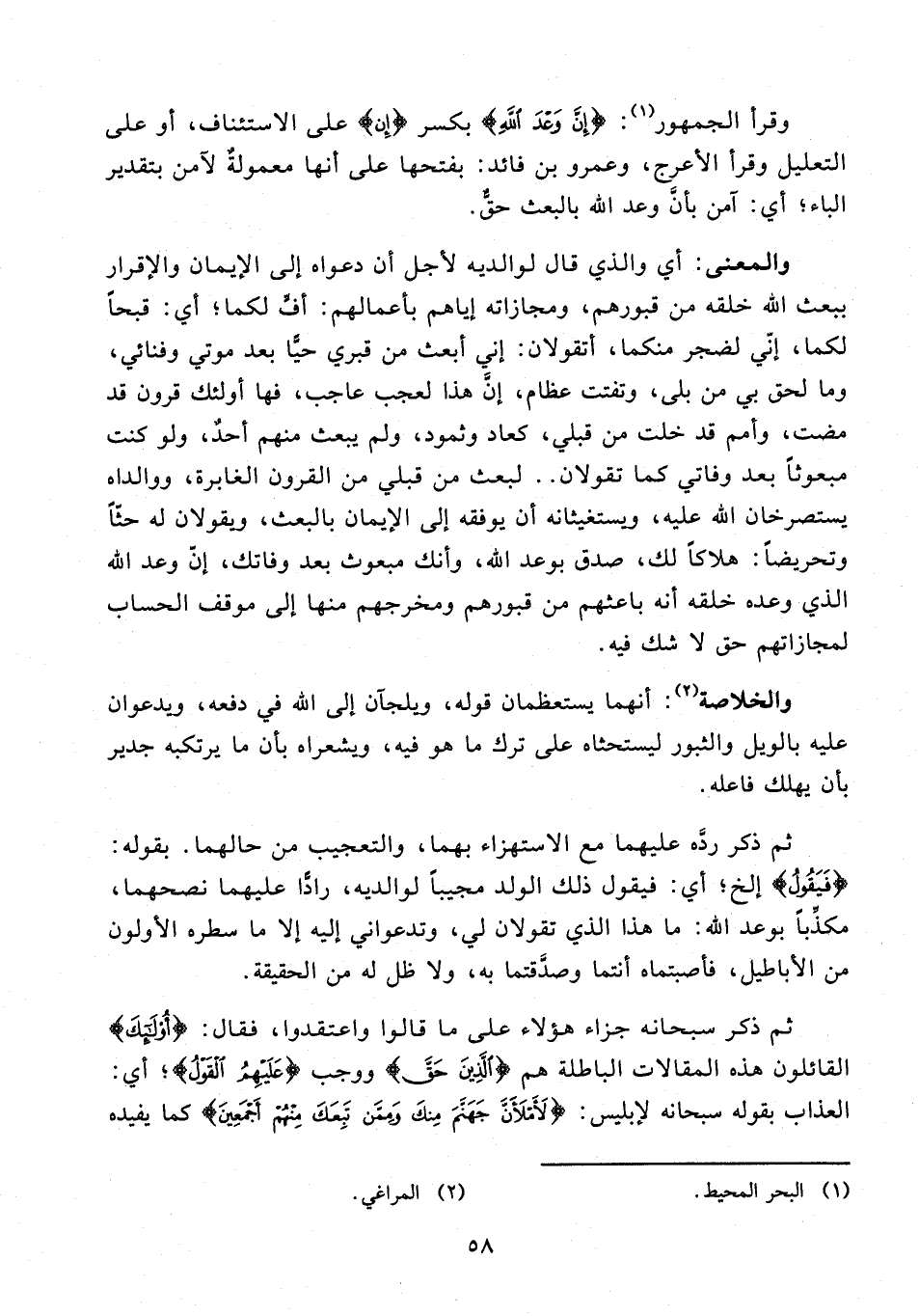 والمعنى: أي والذي قال لوالديه لأجل أن دعواه إلى الإيمان والإقرار ببعث الله خلقه من قبورهم، ومجازاته إياهم بأعمالهم: أفٍّ لكما؛ أي: قبحًا لكما، إنّي لضجر منكما، أتقولان: إني أبعث من قبري حيًّا بعد موتي وفنائي، وما لحق بي من بلى، وتفتت عظام، إنَّ هذا لعجب عاجب، فها أولئك قرون قد مضت، وأمم قد خلت من قبلي، كعاد وثمود، ولم يبعث منهم أحدٌ، ولو كنت مبعوثًا بعد وفاتي كما تقولان .. لبعث من قبلي من القرون الغابرة، ووالداه يستصرخان الله عليه، ويستغيثانه أن يوفقه إلى الإيمان بالبعث، ويقولان له حثًّا وتحريضًا: هلاكًا لك، صدق بوعد الله، وأنك مبعوث بعد وفاتك، إنّ وعد الله في وعده خلقه أنه باعثهم من قبورهم ومخرجهم منها إلى موقف الحساب لمجازاتهم حق لا شك فيه.