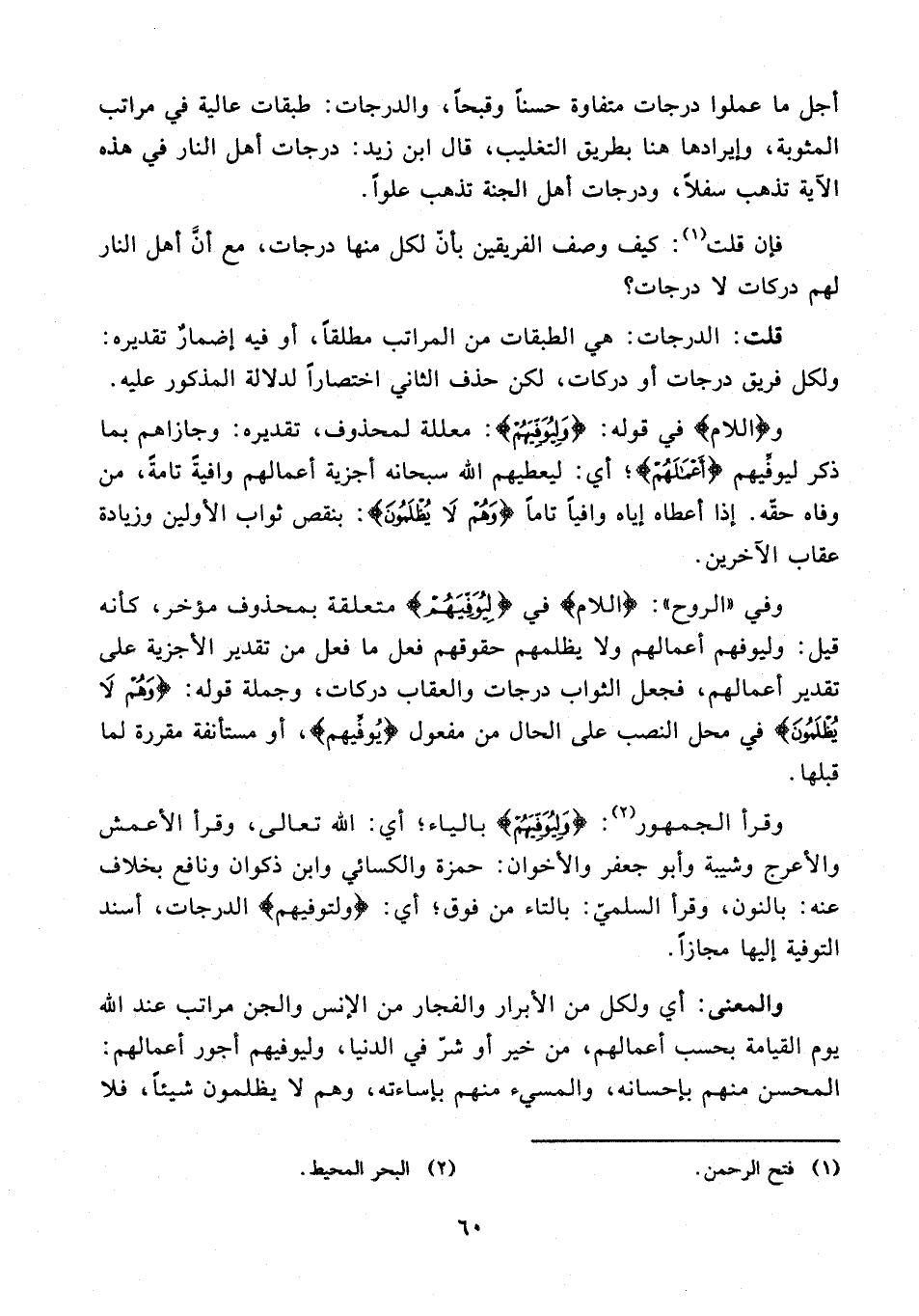 وقرأ الجمهور (¬2): {وَلِيُوَفِّيَهُمْ} بالياء؛ أي: الله تعالى، وقرأ الأعمش والأعرج وشيبة وأبو جعفر والأخوان: حمزة والكسائي وابن ذكوان ونافع بخلاف عنه: بالنون، وقرأ السلميّ: بالتاء من فوق؛ أي: {ولتوفيهم} الدرجات، أسند التوفية إليها مجازًا.