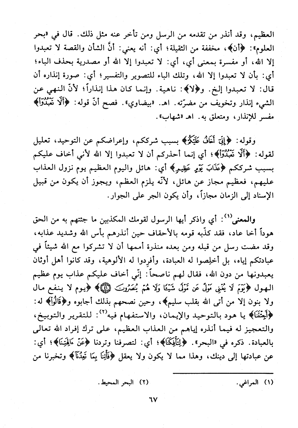 والمعنى (¬1): أي واذكر أيها الرسول لقومك المكذبين ما جئتهم به من الحق هودًا أخا عاد، فقد كذّبه قومه بالأحقاف حين أنذرهم بأس الله وشديد عذابه، وقد مضت رسل من قبله ومن بعده منذرة أممها أن لا تشركوا مع الله شيئًا في عبادتكم إياه، بل أخلِصوا له العبادة، وأفرِدوا له الألوهية، وقد كانوا أهل أوثان يعبدونها من دون الله، فقال لهم ناصحًا: إنّي أخاف عليكم عذاب يوم عظيم الهول {يَوْمَ لَا يُغْنِي مَوْلًى عَنْ مَوْلًى شَيْئًا وَلَا هُمْ يُنْصَرُونَ (41)} {يَوْمَ لَا يَنْفَعُ مَالٌ وَلَا بَنُونَ (88) إِلَّا مَنْ أَتَى اللَّهَ بِقَلْبٍ سَلِيمٍ (89)}،