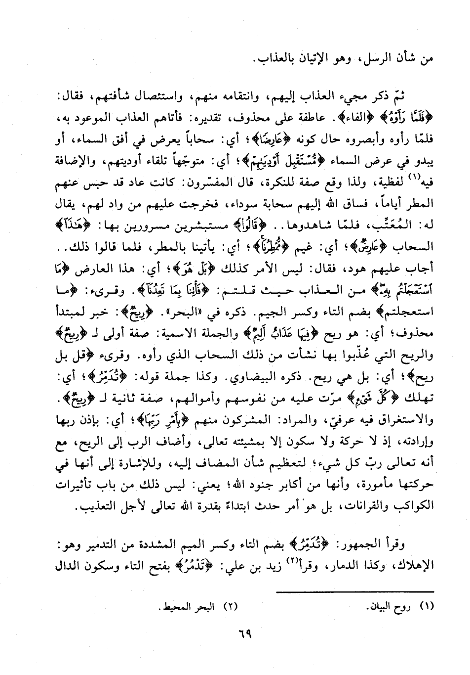 25 - وكذا جملة قوله: {تُدَمِّرُ}؛ أي: تهلك {كُلَّ شَيْءٍ} مرّت عليه من نفوسهم وأموالهم، صفة ثانية لـ {رِيحٌ}. والاستغراق فيه عرفيّ، والمراد: المشركون منهم {بِأَمْرِ رَبِّهَا}؛ أي: بإذن ربها وإرادته، إذ لا حركة ولا سكون إلا بمشيئته تعالى، وأضاف الرب إلى الريح، مع أنه تعالى ربّ كل شيء؛ لتعظيم شأن المضاف إليه، وللإشارة إلى أنها في حركتها مأمورة، وأنها من أكابر جنود الله؛ يعني: ليس ذلك من باب تأثيرات الكواكب والقرانات، بل هو أمر حدث ابتداءً بقدرة الله تعالى لأجل التعذيب.