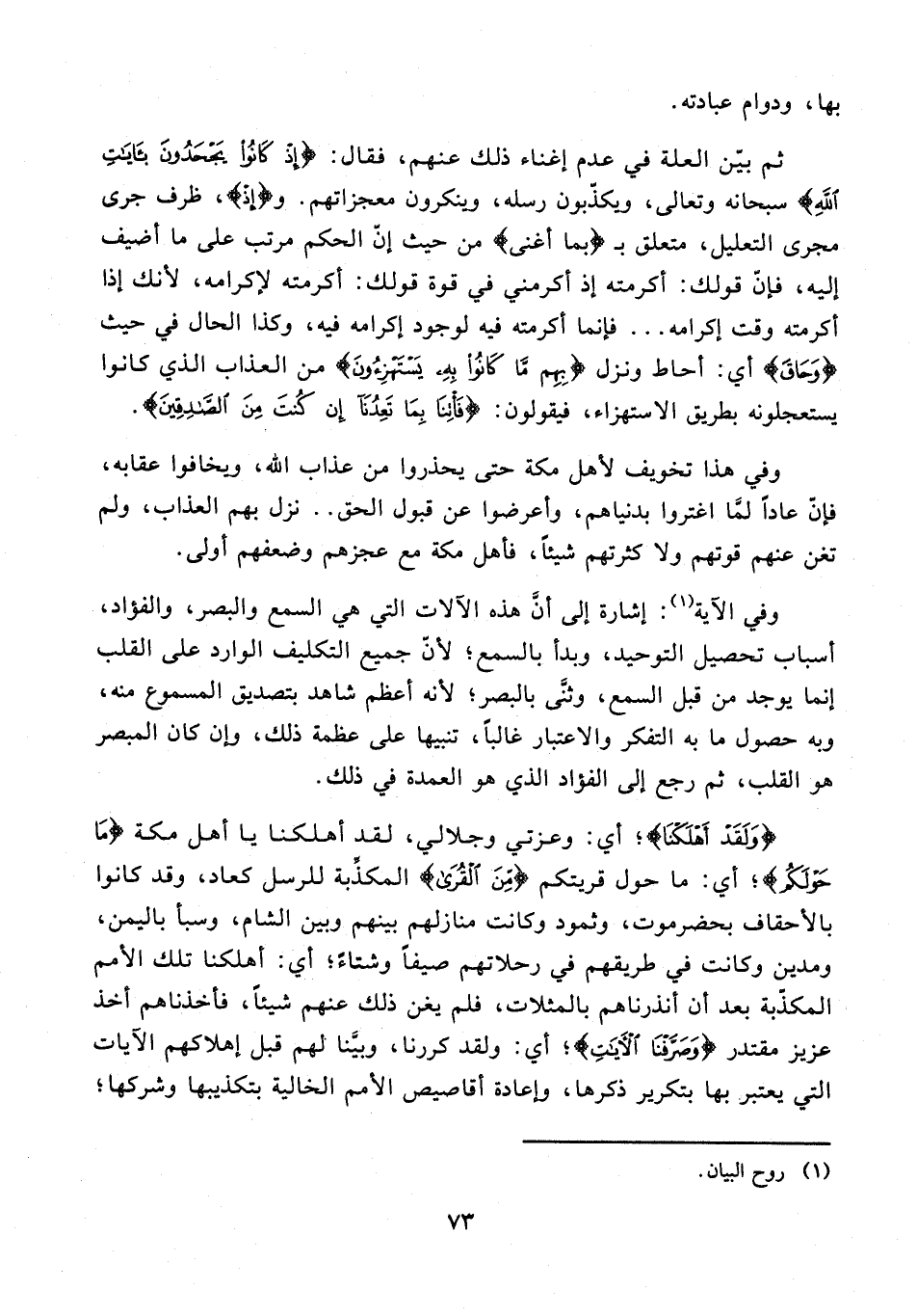 وفي هذا تخويف لأهل مكة حتى يحذروا من عذاب الله، ويخافوا عقابه، فإنّ عادًا لمَّا اغتروا بدنياهم، وأعرضوا عن قبول الحق .. نزل بهم العذاب، ولم تغن عنهم قوتهم ولا كثرتهم شيئًا، فأهل مكة مع عجزهم وضعفهم أولى.