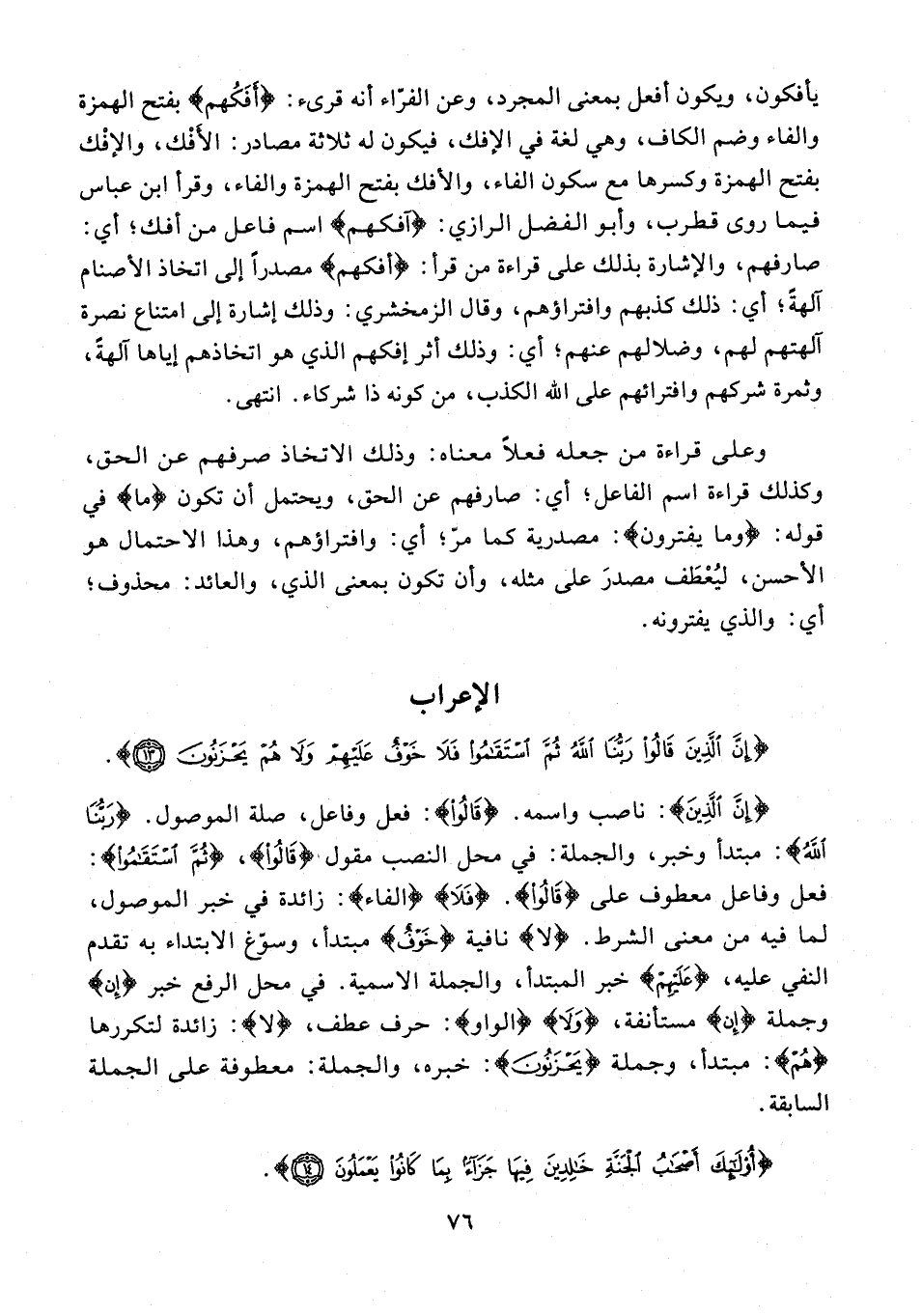 {إِنَّ الَّذِينَ}: ناصب واسمه. {قَالُوا}: فعل وفاعل، صلة الموصول. {رَبُّنَا الله}: مبتدأ وخبر، والجملة: في محل النصب مقول {قَالُوا}، {ثُمَّ اسْتَقَامُوا}: فعل وفاعل معطوف على {قَالُوا}. {فَلَا} {الفاء}: زائدة في خبر الموصول، لما فيه من معنى الشرط. {لا} نافية {خَوْفٌ} مبتدأ، وسوّغ الابتداء به تقدم النفي عليه، {عَلَيْهِمْ} خبر المبتدأ، والجملة الاسمية. في محل الرفع خبر {إِن} وجملة {إن} مستأنفة، {وَلَا} {الواو}: حرف عطف، {لا}: زائدة لتكررها {هُمْ}: مبتدأ، وجملة {يَحْزَنُونَ}: خبره، والجملة: معطوفة على الجملة السابقة.