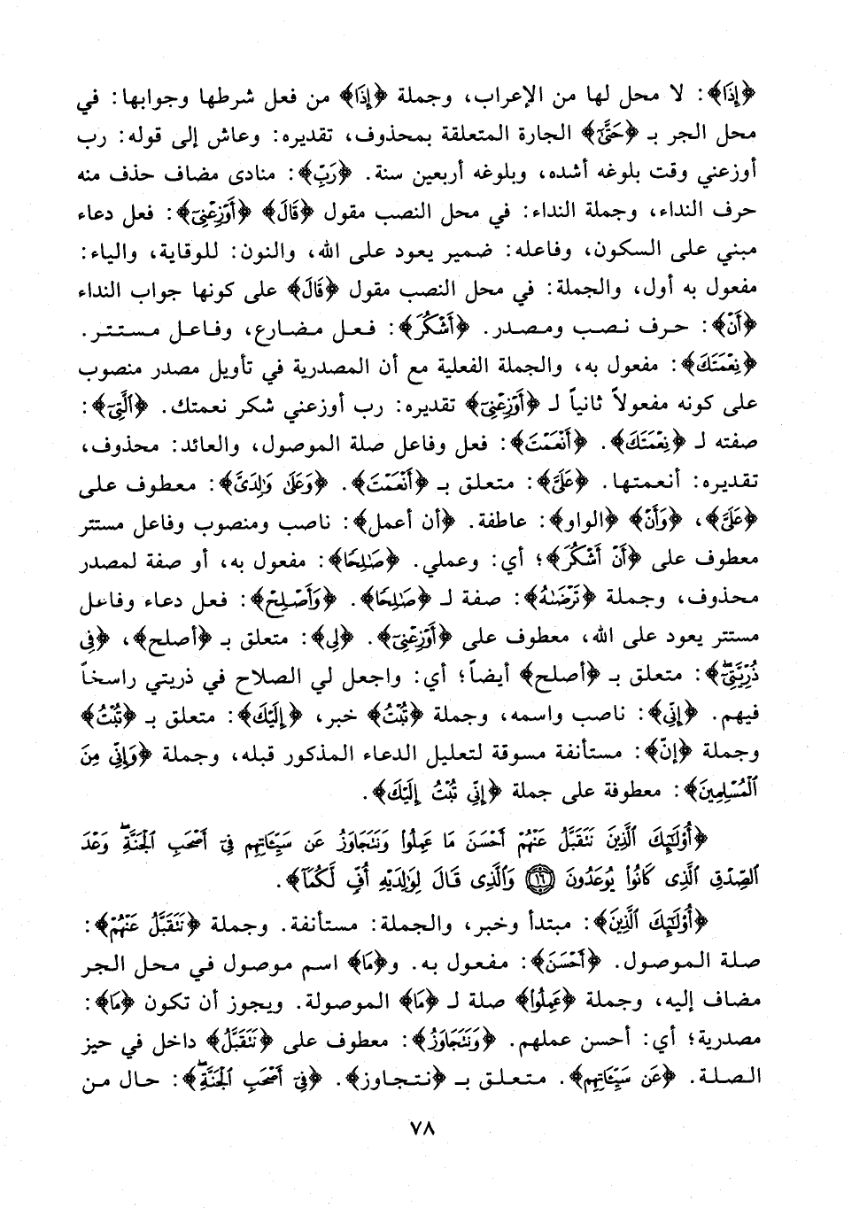 {إِذَا}: لا محل لها من الإعراب، وجملة {إذا} من فعل شرطها وجوابها: في محل الجر بـ {حَتَّى} الجارة المتعلقة بمحذوف، تقديره: وعاش إلى قوله: رب أوزعني وقت بلوغه أشده، وبلوغه أربعين سنة. {رَبِّ}: منادى مضاف حذف منه حرف النداء، وجملة النداء: في محل النصب مقول {قَالَ} {أَوْزِعْنِي}: فعل دعاء مبني على السكون، وفاعله: ضمير يعود على الله، والنون: للوقاية، والياء: مفعول به أول، والجملة: في محل النصب مقول {قَالَ} على كونها جواب النداء {أَن}: حرف نصب ومصدر. {أَشْكُرَ}: فعل مضارع، وفاعل مستتر. {نِعْمَتَكَ}: مفعول به، والجملة الفعلية مع أن المصدرية في تأويل مصدر منصوب على كونه مفعولًا ثانيًا لـ {أَوْزِعْنِي} تقديره: رب أوزعني شكر نعمتك. {الَّتِي}: صفته لـ {نِعْمَتَكَ}. {أَنْعَمْتَ}: فعل وفاعل صلة الموصول، والعائد: محذوف، تقديره: أنعمتها. {عَلَيَّ}: متعلق بـ {أَنْعَمْتَ}. {وَعَلَى وَالِدَيَّ}: معطوف على {عَلَيَّ}، {وَأَن} {الواو}: عاطفة. {أن أعمل}: ناصب ومنصوب وفاعل مستتر معطوف على {أَنْ أَشْكُرَ}؛ أي: وعملي. {صَالِحًا}: مفعول به، أو صفة لمصدر محذوف، وجملة {تَرْضَاهُ}: صفة لـ {صَالِحًا}. {وَأَصْلِحْ}: فعل دعاء وفاعل مستتر يعود على الله، معطوف على {أَوْزِعْنِي}. {لِي}: متعلق بـ {أصلح}، {في ذُرِّيَّتِي}: متعلق بـ {أصلح} أيضًا؛ أي: واجعل لي الصلاح في ذريتي راسخًا فيهم. {إِنِّي}: ناصب واسمه، وجملة {تُبْتُ} خبر، {إِلَيْكَ}: متعلق بـ {تُبْتُ} وجملة {إِنّ}: مستأنفة مسوقة لتعليل الدعاء المذكور قبله، وجملة {وَإِنِّي مِنَ الْمُسْلِمِينَ}: معطوفة على جملة {إِنِّي تُبْتُ إِلَيْكَ}.