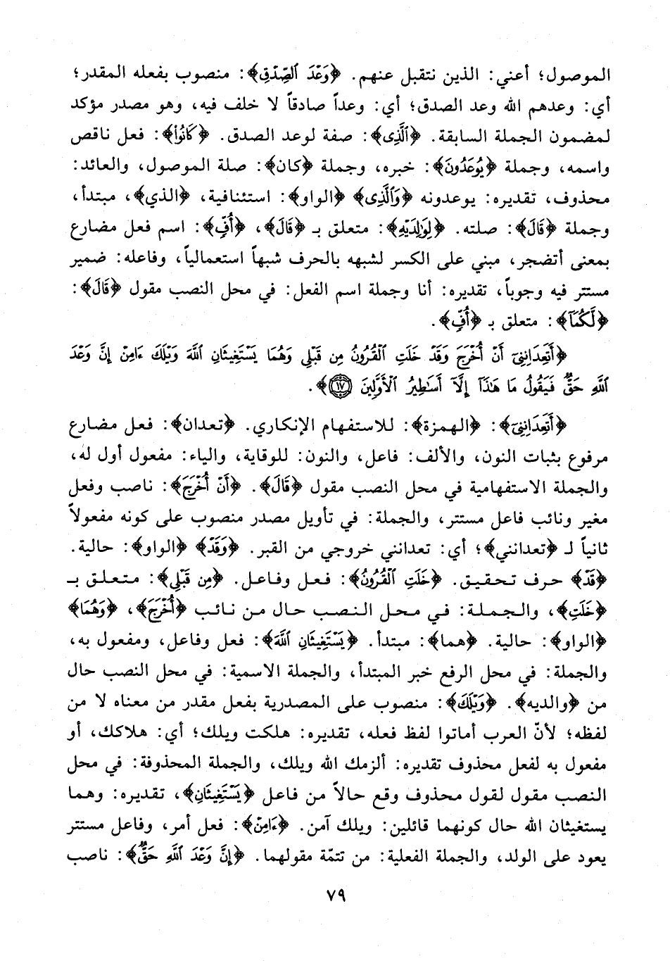 الموصول؛ أعني: الذين نتقبل عنهم. {وَعْدَ الصِّدْقِ}: منصوب بفعله المقدر؛ أي: وعدهم الله وعد الصدق؛ أي: وعدًا صادقًا لا خلف فيه، وهو مصدر مؤكد لمضمون الجملة السابقة. {الَّذِي}: صفة لوعد الصدق. {كَانُوا}: فعل ناقص واسمه، وجملة {يُوعَدُونَ}: خبره، وجملة {كان}: صلة الموصول، والعائد: محذوف، تقديره: يوعدونه {وَالَّذِي} {الواو}: استئنافية، {الذي}، مبتدأ، وجملة {قَالَ}: صلته. {لِوَالِدَيْهِ}: متعلق بـ {قَالَ}، {أُفٍّ}: اسم فعل مضارع بمعنى أتضجر، مبني على الكسر لشبهه بالحرف شبهًا استعماليًا، وفاعله: ضمير مستتر فيه وجوبًا، تقديره: أنا وجملة اسم الفعل: في محل النصب مقول {قَالَ}: {لَكُمَا}: متعلق بـ {أُفٍّ}.