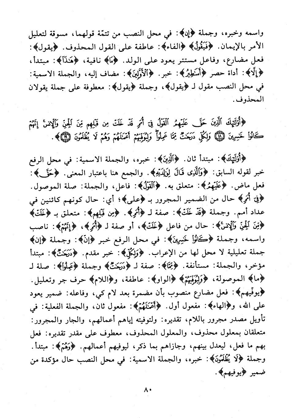 {أُولَئِكَ}: مبتدأ ثان. {الَّذِينَ}: خبره، والجملة الاسمية: في محل الرفع خبر لقوله السابق: {وَالَّذِي قَالَ لِوَالِدَيْهِ}. والجمع هنا باعتبار المعنى. {حَقَّ}: فعل ماض. {عَلَيْهِمُ}: متعلق به. {الْقَوْلُ}: فاعل، والجملة: صلة الموصول. {في أُمَمٍ} حال من الضمير المجرور بـ {على}؛ أي: حال كونهم كائنين في عداد أمم. وجملة {قَدْ خَلَتْ}: صفة لـ {أُمَمٍ}. {مِنْ قَبْلِهِمْ}: متعلق بـ {خَلَتْ} {مِنَ الْجِنِّ وَالْإِنْسِ}: حال من فاعل {خَلَتْ}، أو صفة لـ {أُمَمٍ}، {إِنَّهُمْ}: ناصب واسمه، وجملة {كَانُوا خَاسِرِينَ}: في محل الرفع خبر {إنّ}: وجملة {إن} جملة تعليلية لا محل لها من الإعراب. {وَلِكُلٍّ}: خبر مقدم. {دَرَجَاتٌ}: مبتدأ مؤخو، والجملة: مستأنفة. {مِمَّا}: صفة لـ {دَرَجَاتٌ} وجملة {عَمِلُوا}: صلة لـ {ما} الموصولة، {وَلِيُوَفِّيَهُمْ} {الواو}: عاطفة، و {اللام} حرف جر وتعليل. {يُوَفِّيَهُمْ}: فعل مضارع منصوب بأن مضمرة بعد لام كي، وفاعله: ضمير يعود على الله، و {الهاء}: مفعول أول. {أَعْمَالَهُمْ}: مفعول ثان، والجملة الفعلية: في تأويل مصدر مجرور باللام، تقديره: ولتوفيته إياهم أعمالهم، والجار والمجرور: متعلقان بمعلول محذوف، والمعلول المحذوف، معطوف على مقدر تقديره: فعل بهم ما فعل، ليعدل بينهم، وجازاهم بما ذكر، ليوفيهم أعمالهم. {وَهُمْ}: مبتدأ. وجملة {لَا يُظْلَمُونَ}: خبره، والجملة الاسمية: في محل النصب حال مؤكدة من ضمير {يوفيهم}.